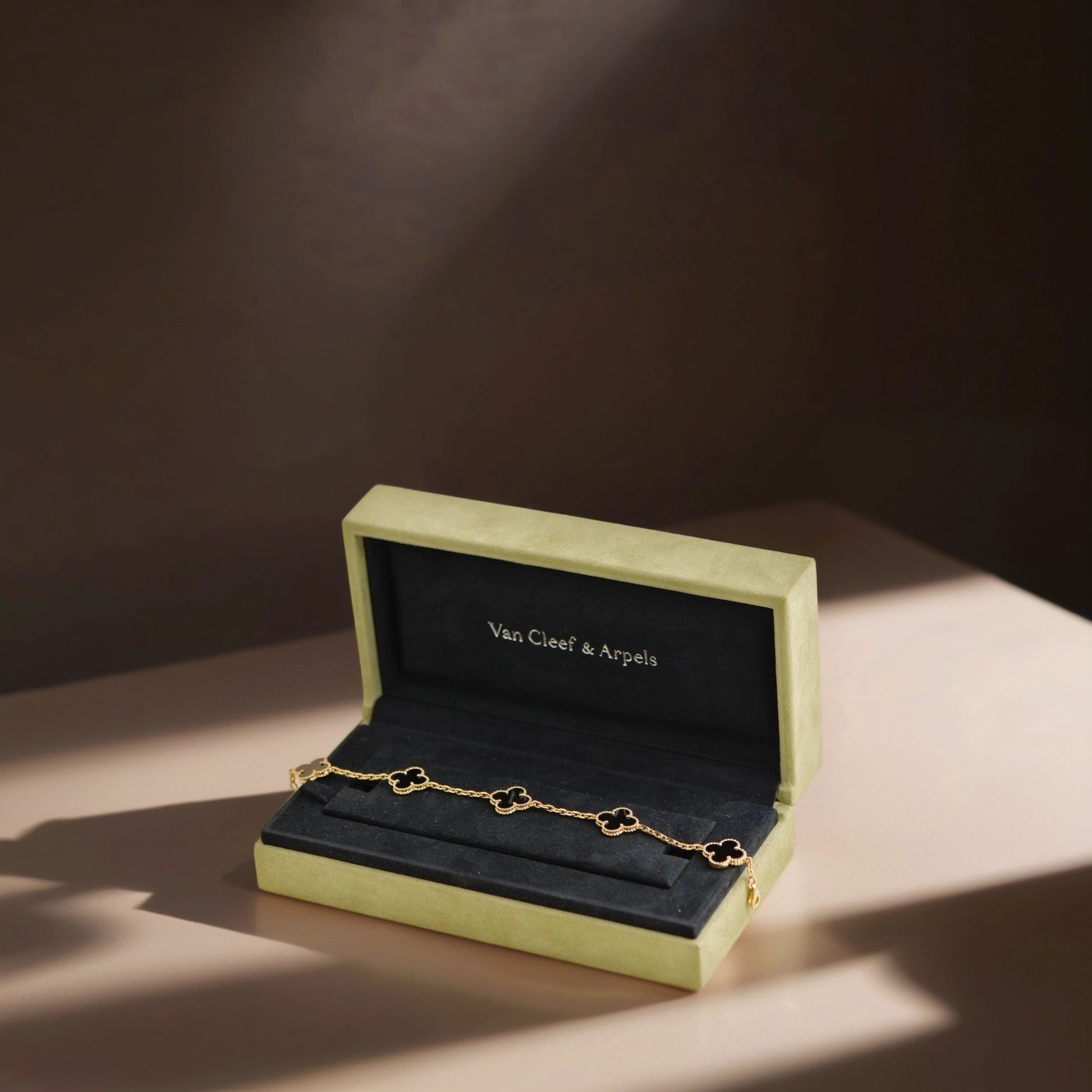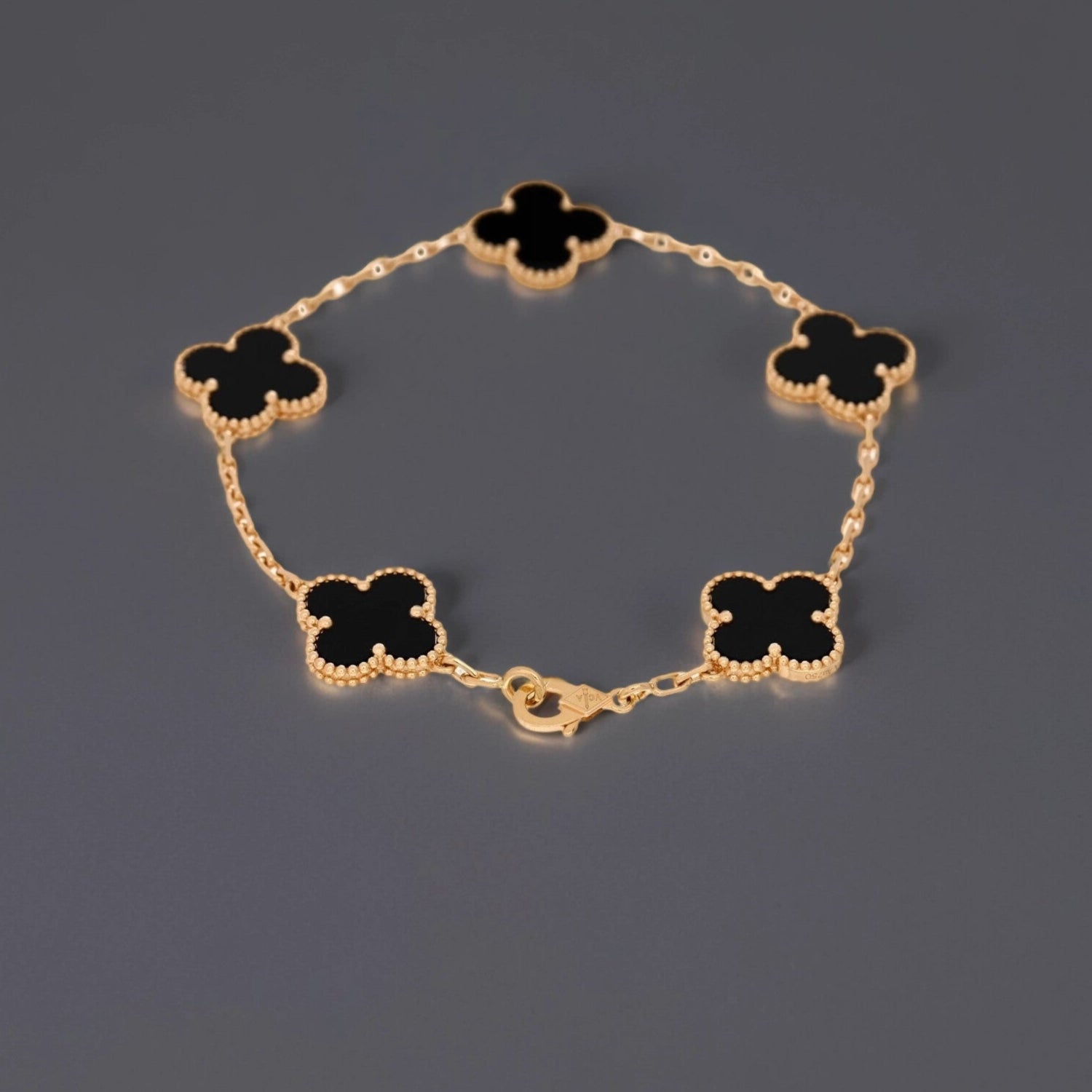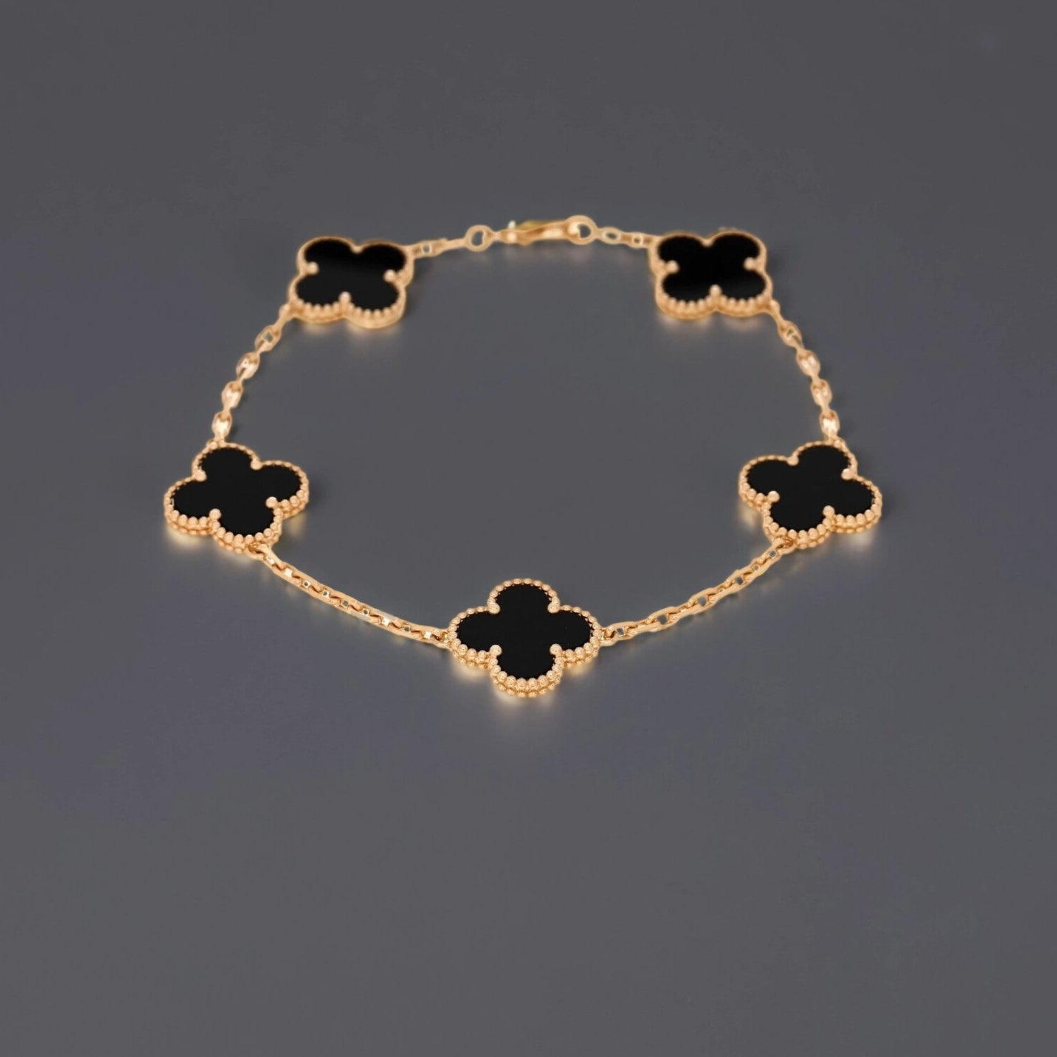 18K Yellow Gold Black Onyx 5 Motifs Vintage Alhambra Bracelet