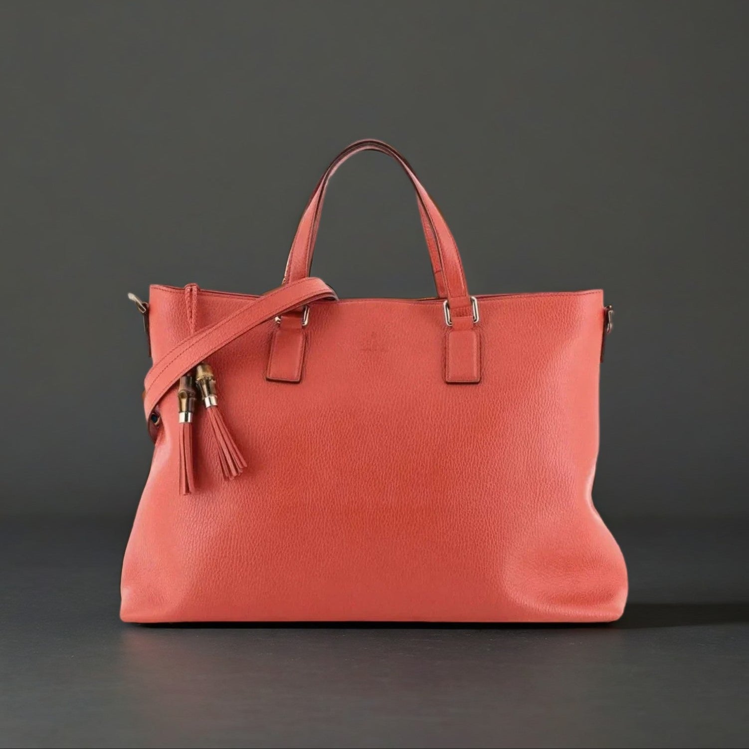 This Gucci Bamboo Tassel Convertible Zip Tote Leather Large, crafted from red leather, features dual flat top handles and gold-tone hardware. Its zip closure opens to a brown fabric interior with zip and slip pockets.