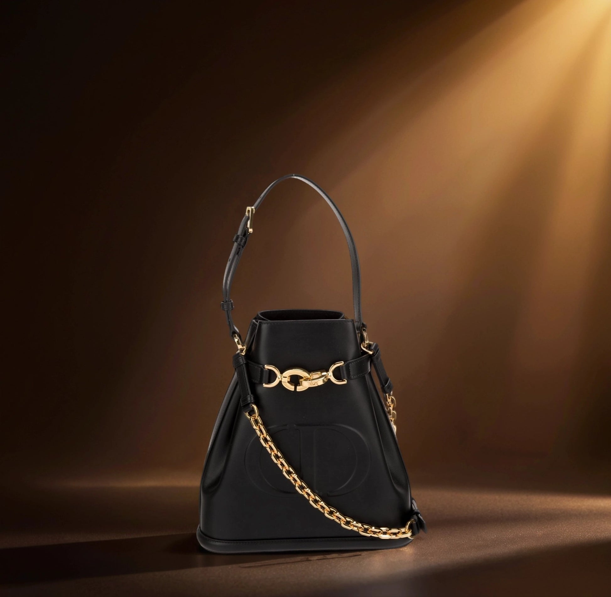 Calfskin CD Embossed Medium C'est Chain Bucket Bag Black