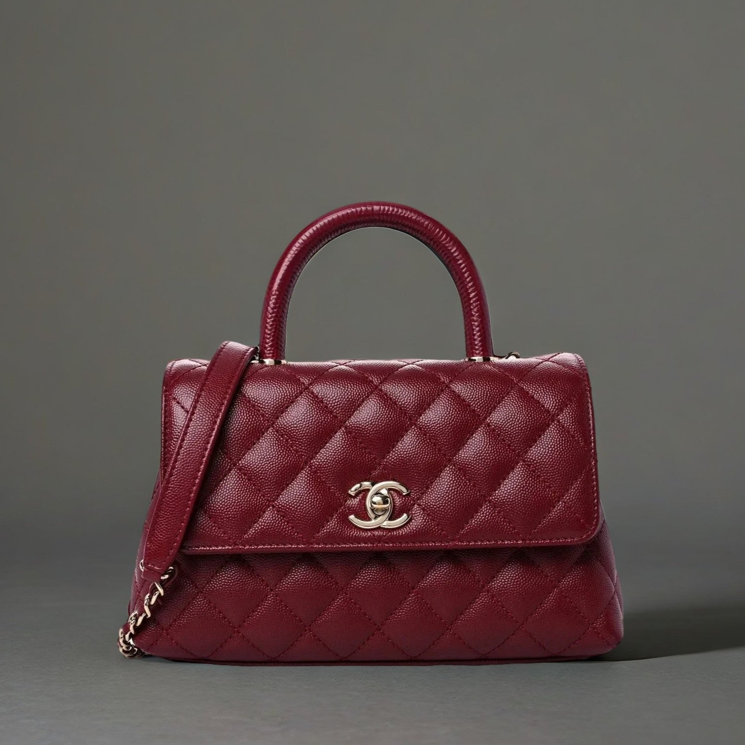 This is an authentic CHANEL Caviar Lizard Embossed Quilted Mini Coco Handle Flap in Burgundy. This classic tote is crafted of diamond quilted caviar leather in burgundy. It features a lizard embossed leather top handle, a rear patch pocket, a leather threaded aged gold chain link shoulder strap with a shoulder pad and an aged gold Chanel CC turn lock. The flap opens to a partitioned burgundy leather interior with zipper and patch pockets.