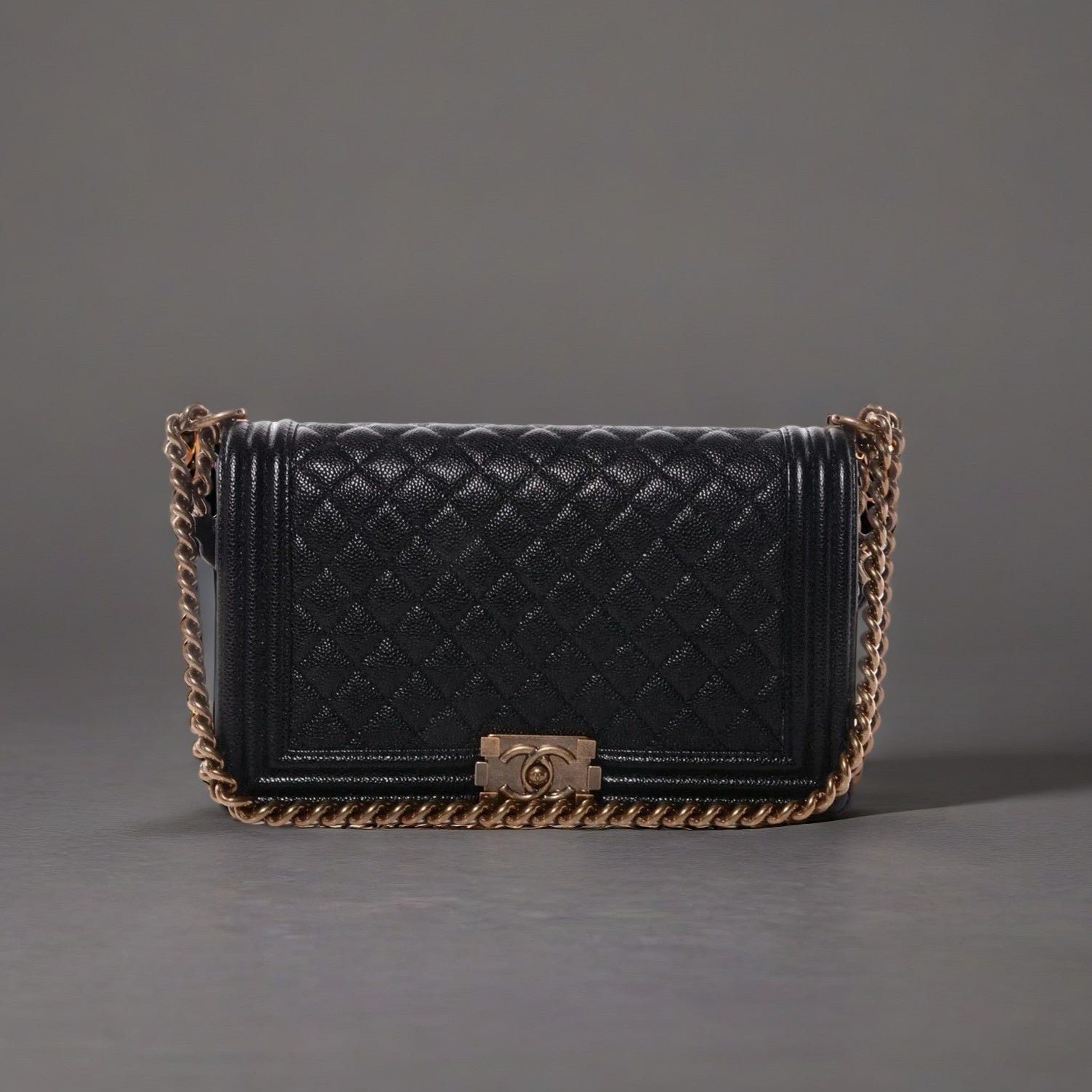 This is an authentic CHANEL Caviar Medium Boy Flap Bag in Black- NEW. This stylish shoulder bag is crafted of luxurious diamond quilted caviar leather framed by a linear quilting. The bag features an aged gold chain link shoulder strap with a leather shoulder pad and a unique squared aged gold Chanel CC press lock. This opens to a fabric interior. This is a marvelous shoulder bag, ideal for day and evening use, only from Chanel!
