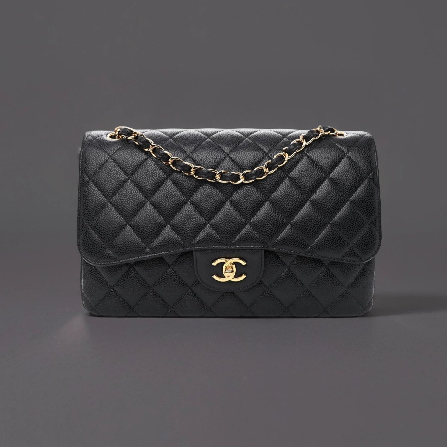 authentic CHANEL Caviar Quilted Jumbo Double Flap in Black. This shoulder bag is crafted of luxurious black calfskin leather with iconic diamond-shaped stitched quilting. The bag has classic polished gold chain shoulder gold threaded with black leather and a gold Chanel CC turn lock. This opens with a front flap to an additional flap to a burgundy leather interior with patch pockets.