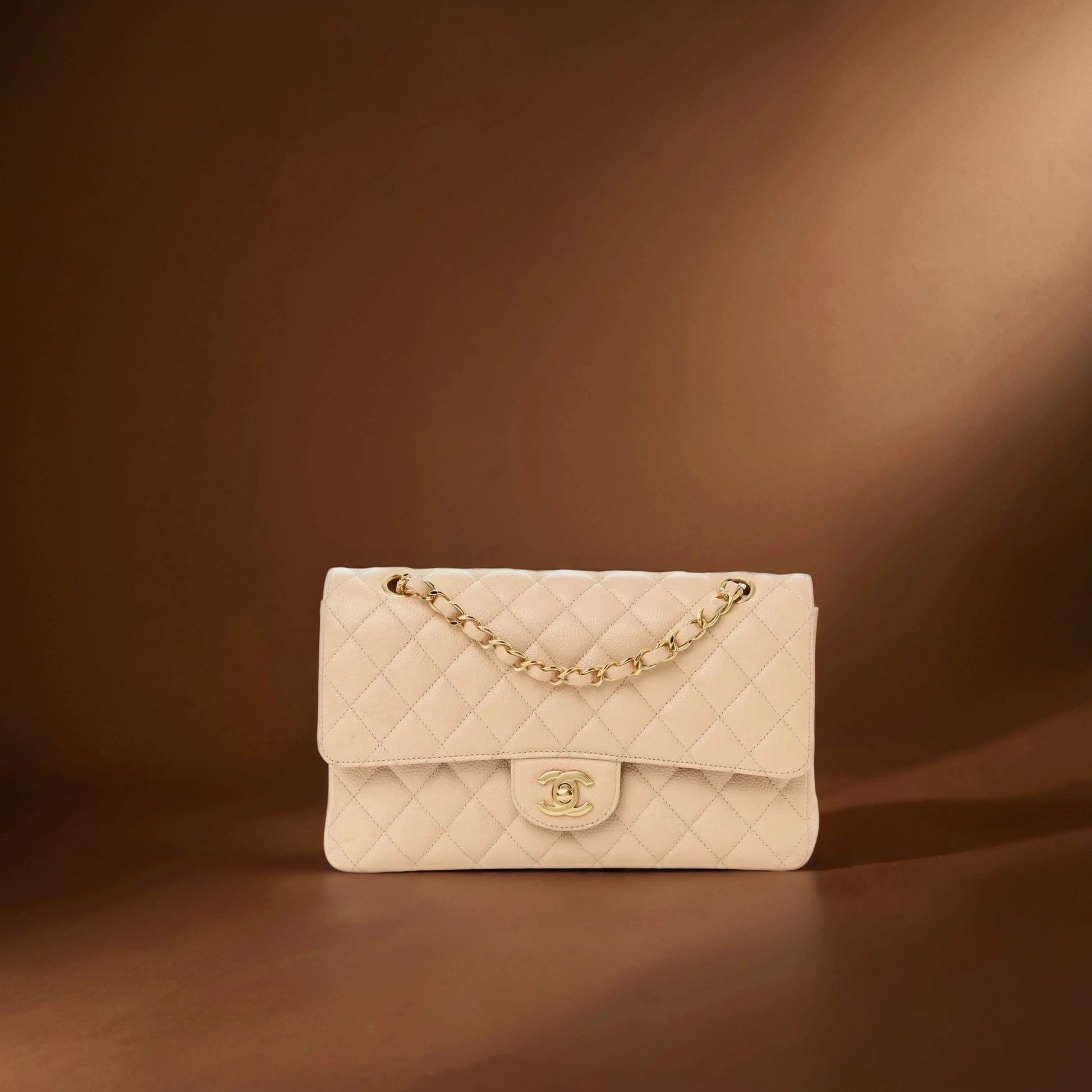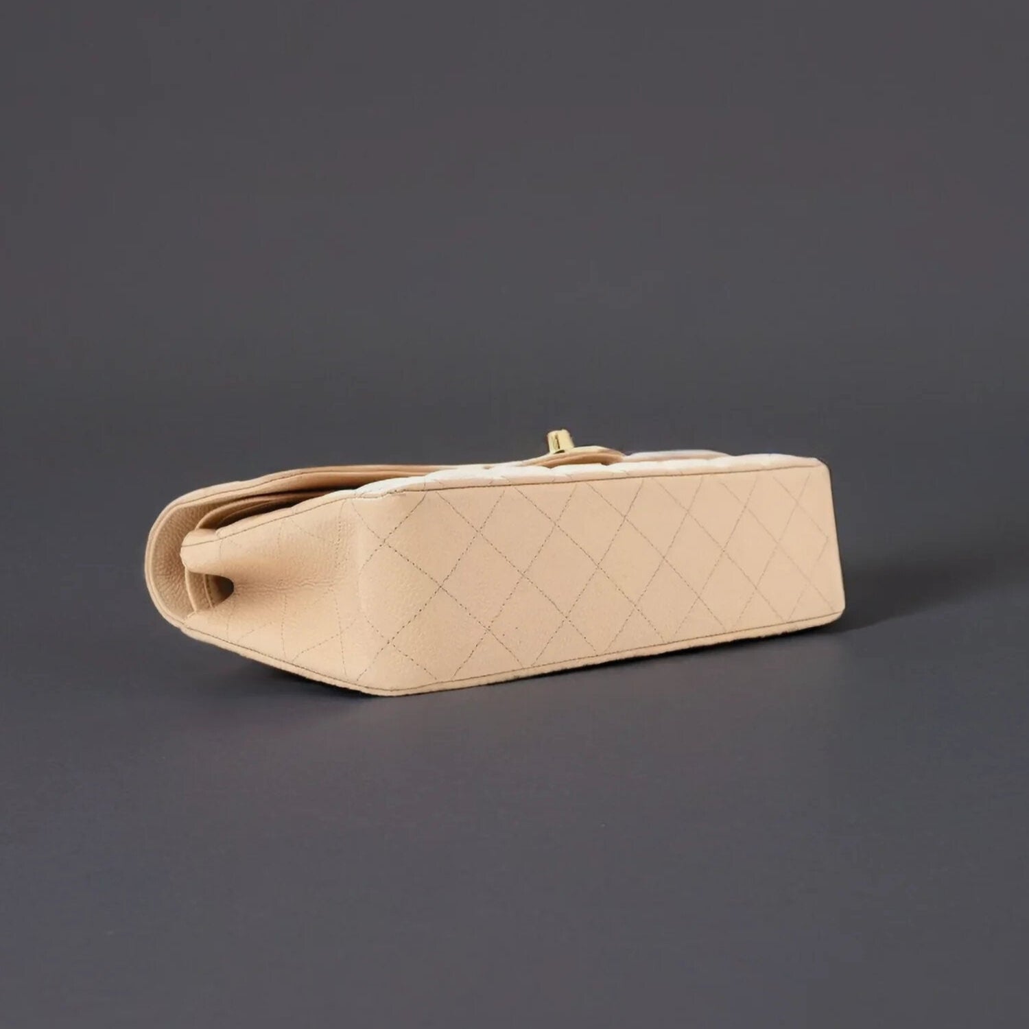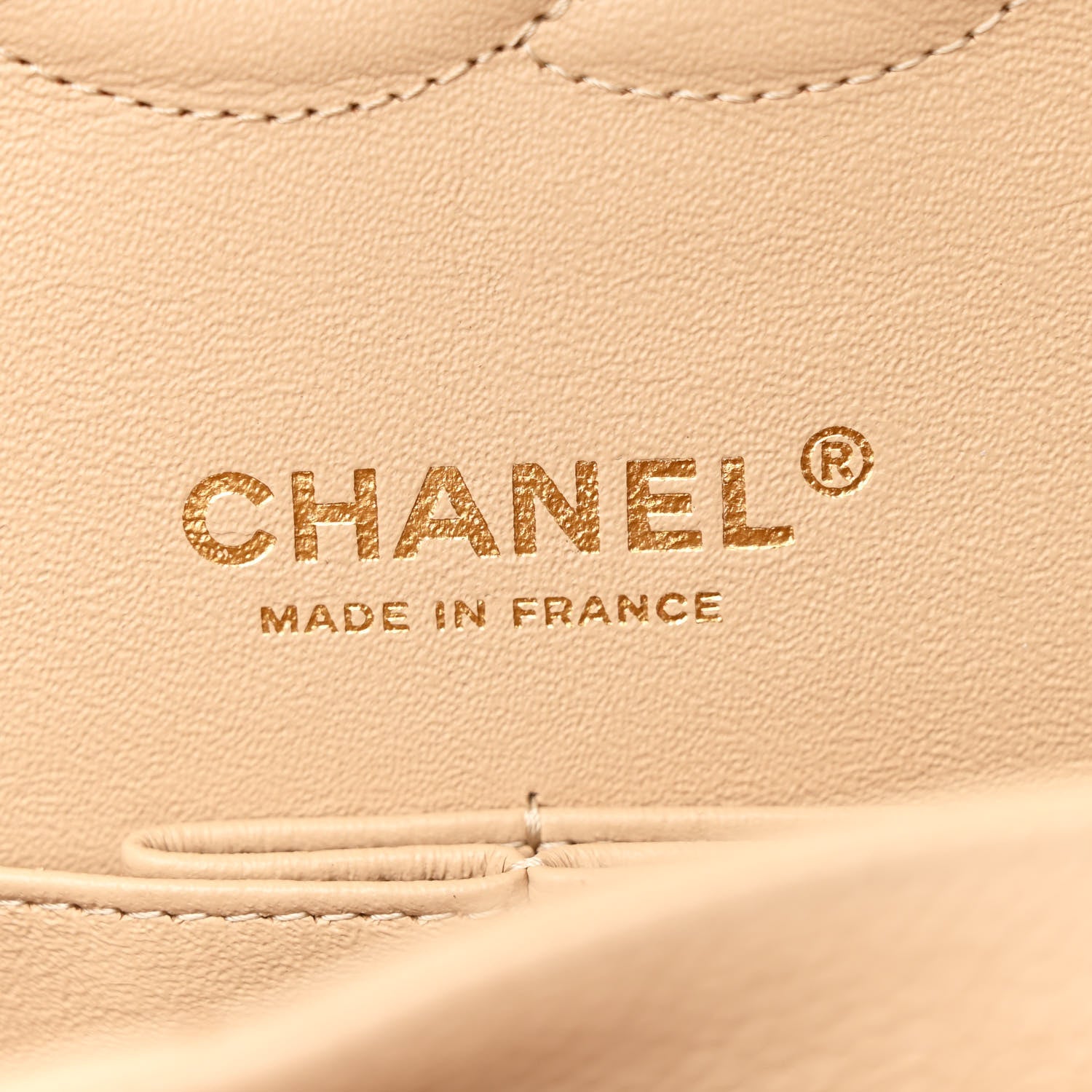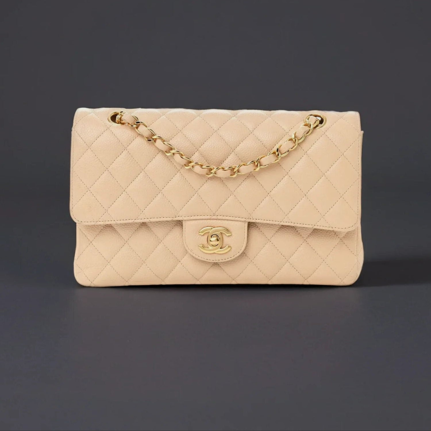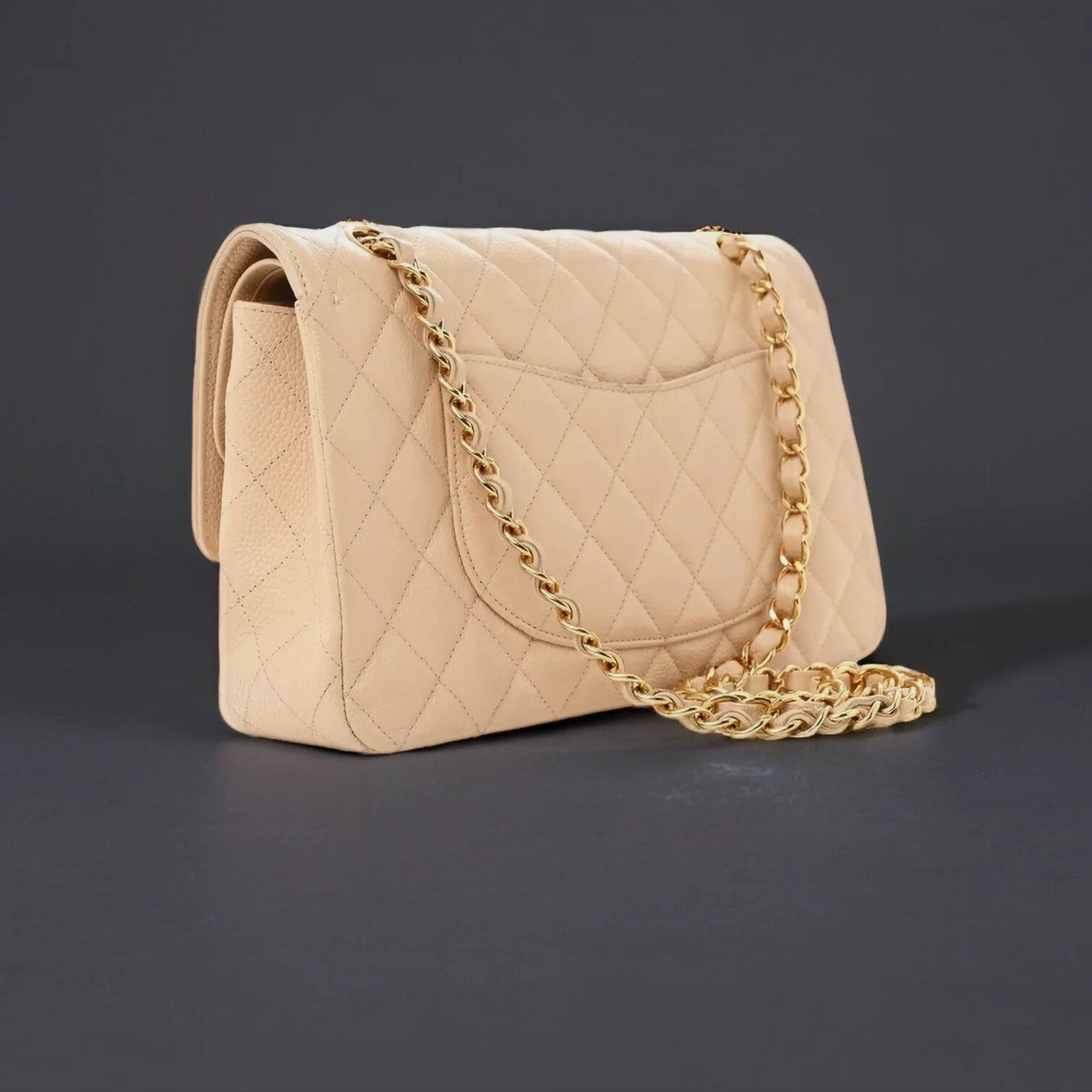 This is an authentic CHANEL Caviar Quilted Medium Double Flap in Beige. This stylish shoulder bag is crafted of luxurious caviar leather in light beige. The bag features polished gold chain link leather threaded shoulder straps and Chanel CC interlocking turn lock for the front flap. This opens to an inner flap and a matching leather interior with patch pockets.