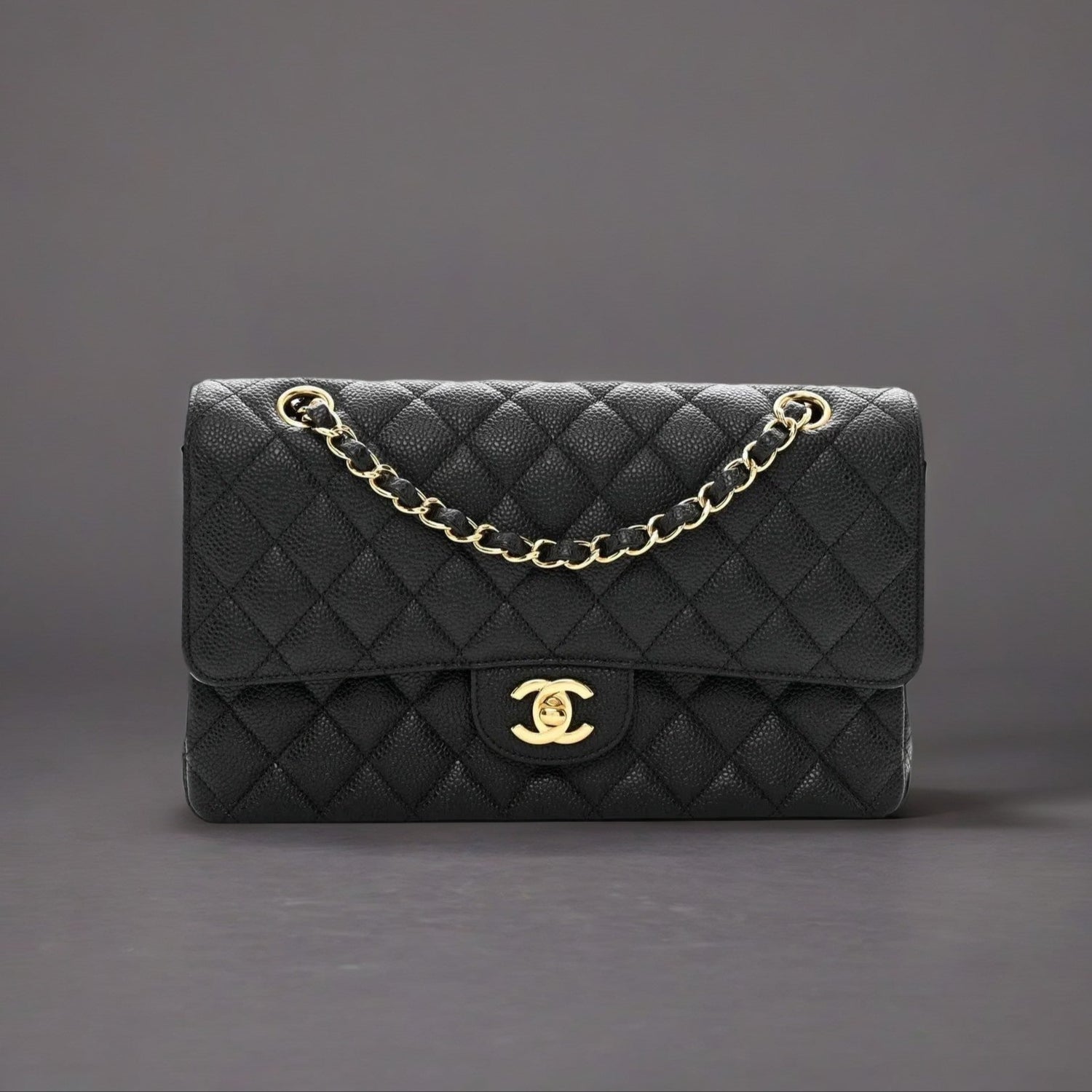 This is an authentic CHANEL Caviar Quilted Medium Double Flap in Black. This elegant shoulder bag is crafted of luxurious caviar textured leather in black. The bag features a leather-threaded gold chain-link shoulder strap, a rear patch pocket, and a crossover flap with a gold classic CC turn lock. The flap opens to reveal an inner flap and a burgundy leather interior with pockets.
