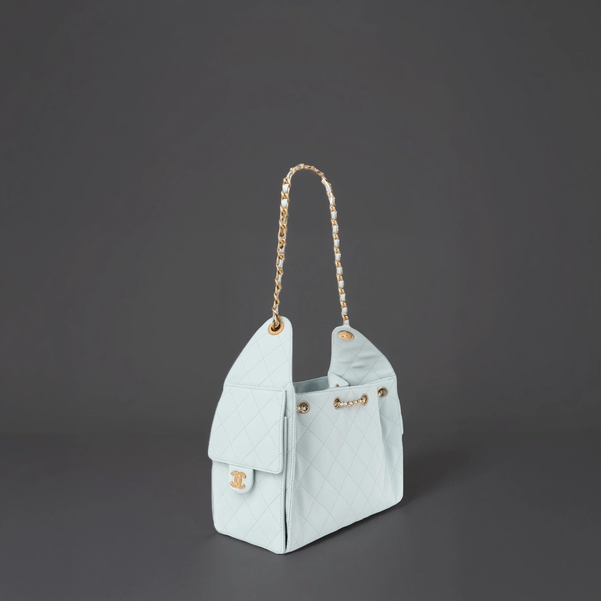 This is an authentic CHANEL 25 Caviar Quilted Small in Light Blue. This chic shoulder bag is crafted of caviar calfskin leather in light blue. The bag features a gold chain leather shoulder strap, side exterior pockets with gold CC logos, and a gold chain leather cinch cord. The top opens to a blue fabric interior with pockets.