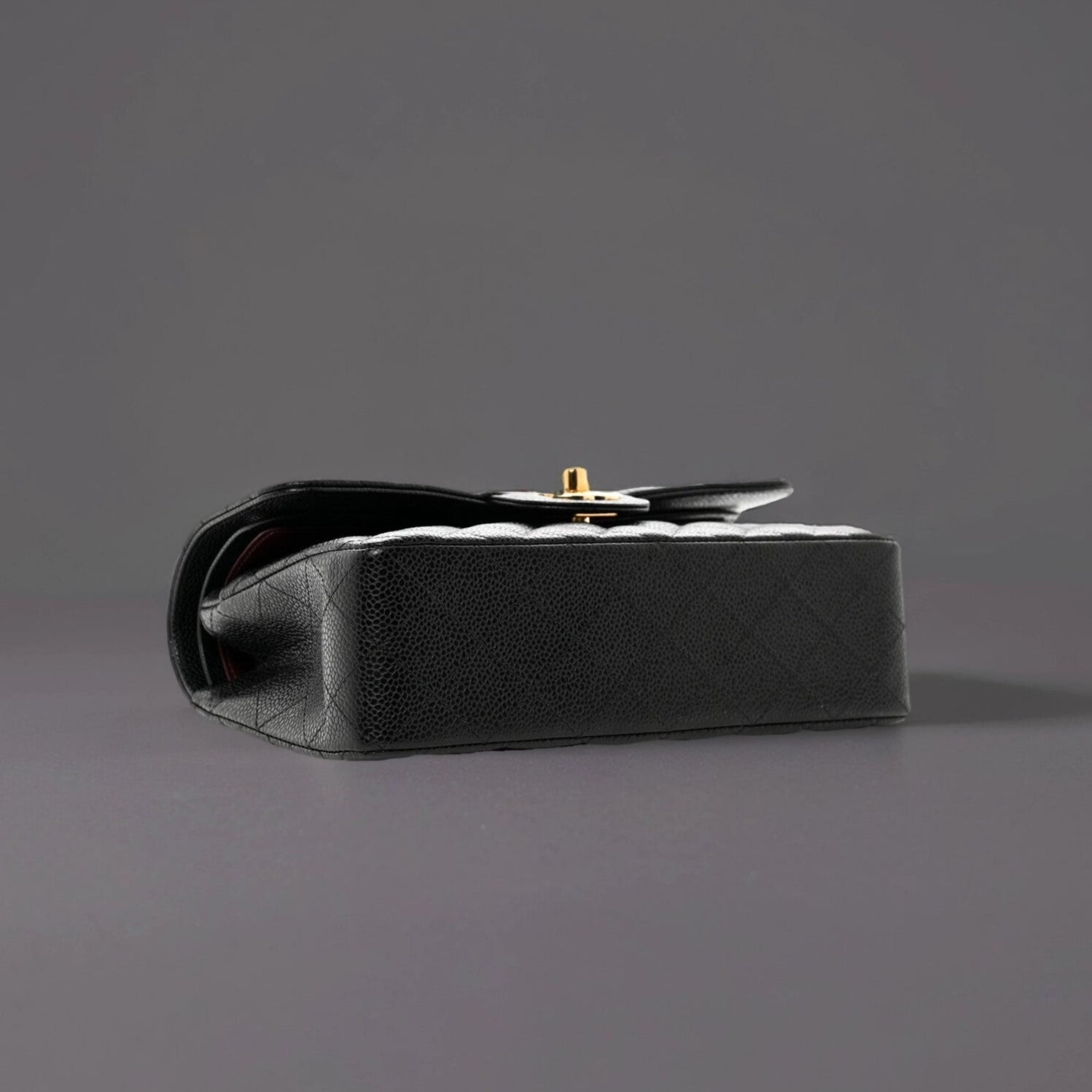 This is an authentic CHANEL Caviar Quilted Small Double Flap in Black. This chic shoulder bag is crafted of diamond quilted caviar leather in black. The bag features a gold chain link leather threaded shoulder strap and front flap with a gold Chanel CC turn lock. The flap opens to reveal an inner flap and a burgundy leather interior with patch pockets.