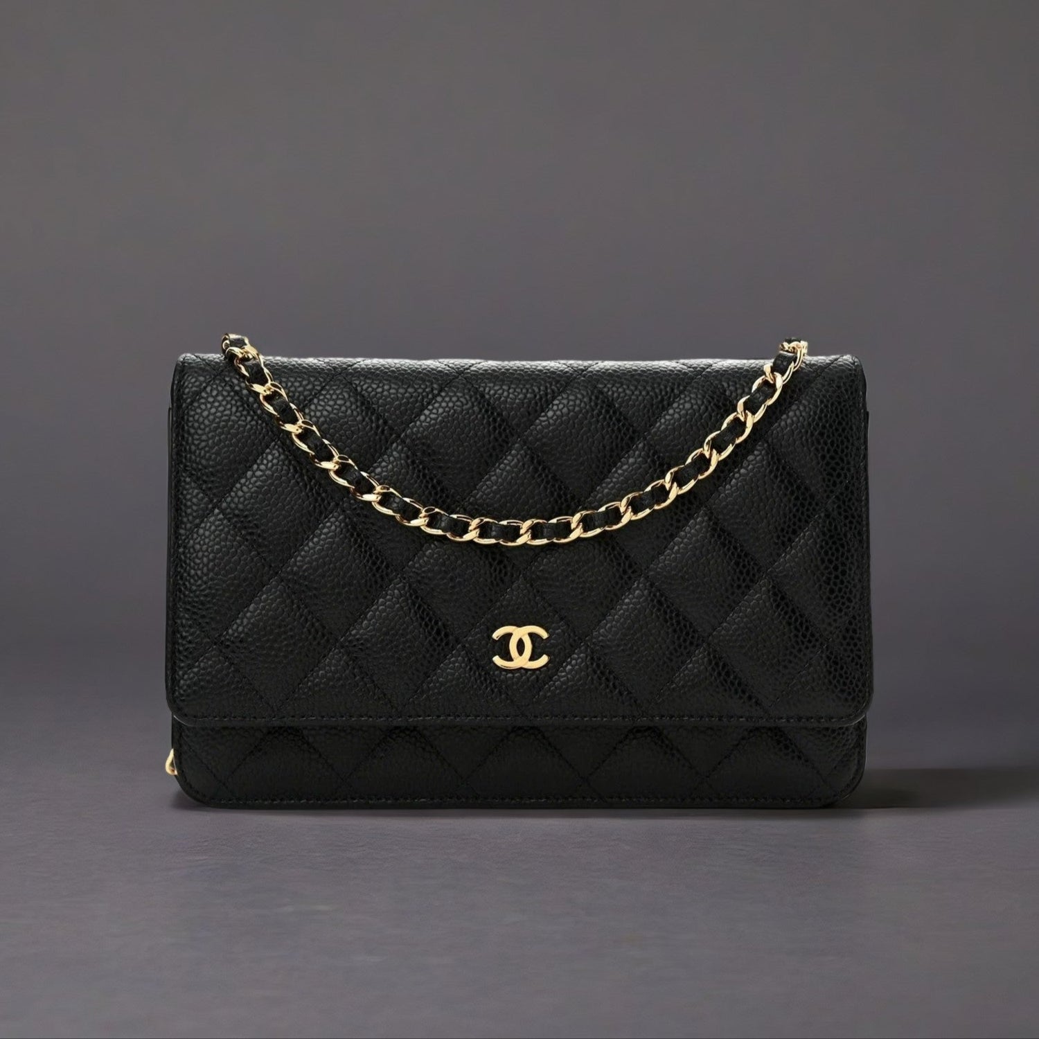 This is an authentic CHANEL Caviar Quilted Wallet on Chain WOC in Black. This stylish wallet is crafted of luxuriously textured diamond quilted caviar leather in black. This shoulder bag features a gold chain-link crossbody strap and a Chanel CC logo on the facing flap. The bag opens to a burgundy fabric interior with a zipper compartment, card slots, and a leather patch pocket.