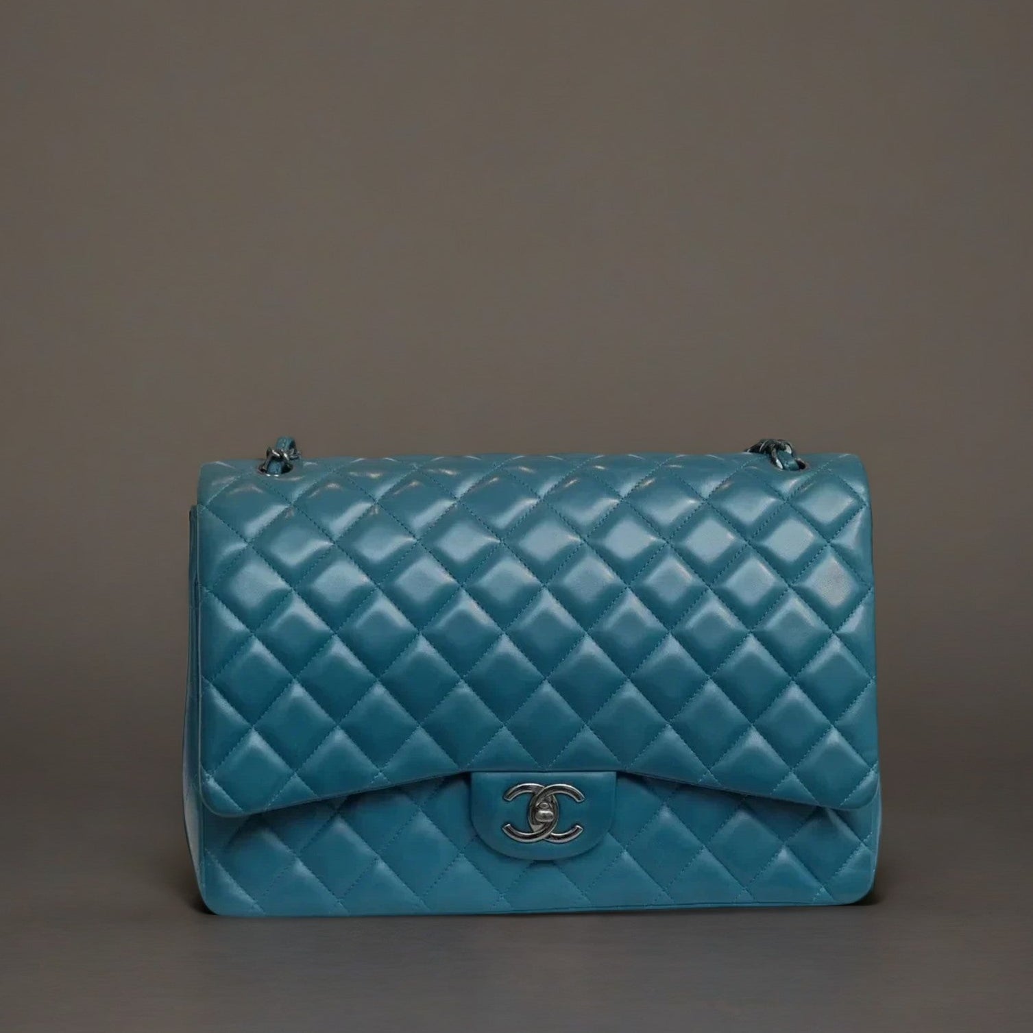 CHANEL Lambskin Quilted Jumbo Single Flap Blue . This is a stylish Chanel flap bag that is crafted of luxuriously soft diamond-quilted lambskin leather in blue. This shoulder bag features leather threaded matte gold chain-link shoulder straps and a gold Chanel CC turn lock. This opens to a matte blue leather interior with zipper and patch pockets. This is a fabulous shoulder bag for day and evening, only from Chanel.