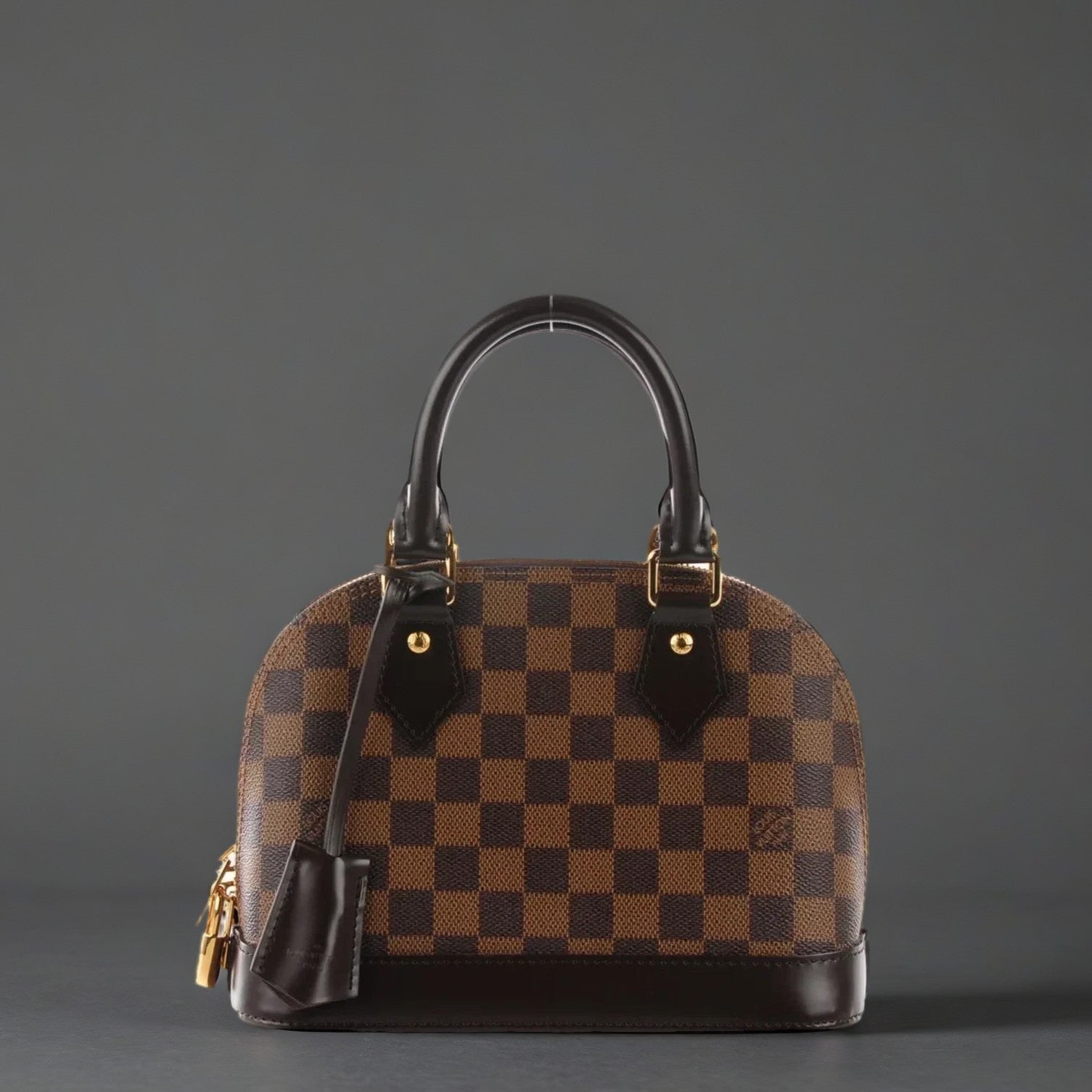 We guarantee this is an authentic LOUIS VUITTON Damier Ebene Alma BB. This mini bowling style tote is crafted of Louis Vuitton signature checked coated canvas. The bag features extensive brown polished cowhide leather including a solid base, rolled leather top handles and trim, a clochette for keys and brass hardware including a padlock. The top zippers open to a red fabric interior with a flat pocket. This sophisticated bag is suitable for everyday use, by Louis Vuitton.