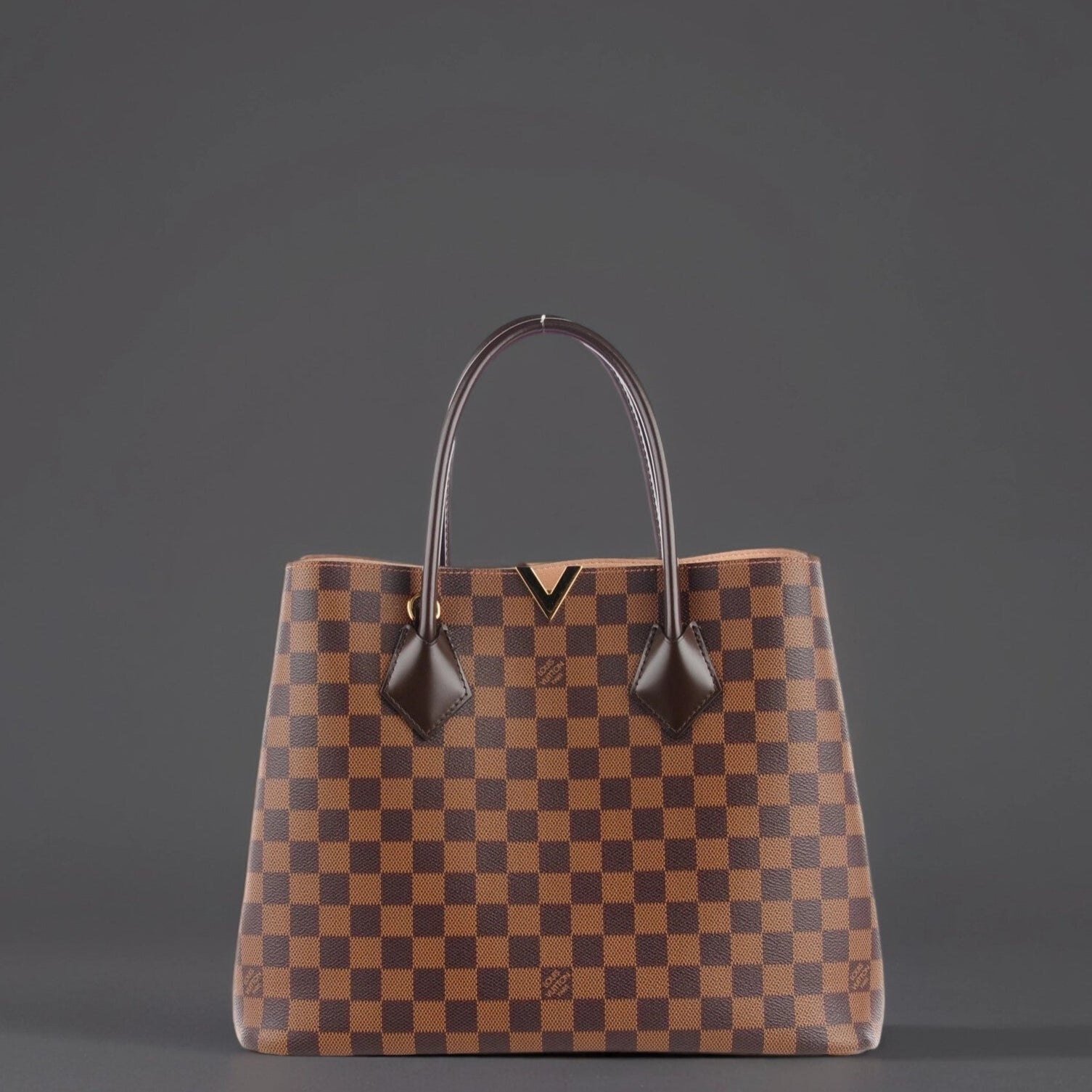 We guarantee this is an authentic LOUIS VUITTON Damier Ebene Kensington or 100% of your money back. This chic tote is crafted of signature damier toile check canvas. The bag features tall rolled mocha brown leather top handles with a cut out V at the top center in gold. The top is open to a partitioned beige microfiber interior ideal for everyday essentials with the luxury and style of Louis Vuitton!