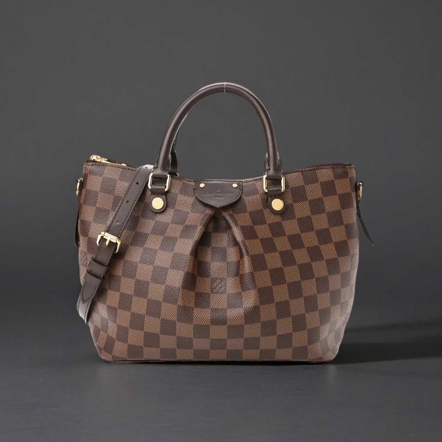 This is an authentic LOUIS VUITTON Damier Ebene Siena PM. This stylish tote is crafted of Louis Vuitton Damier on pleated, coated canvas in brown. The bag features chocolate brown leather trim, rolled top handles, and an optional, adjustable shoulder strap with polished brass hardware. The top zipper opens to a red fabric interior with patch pockets.