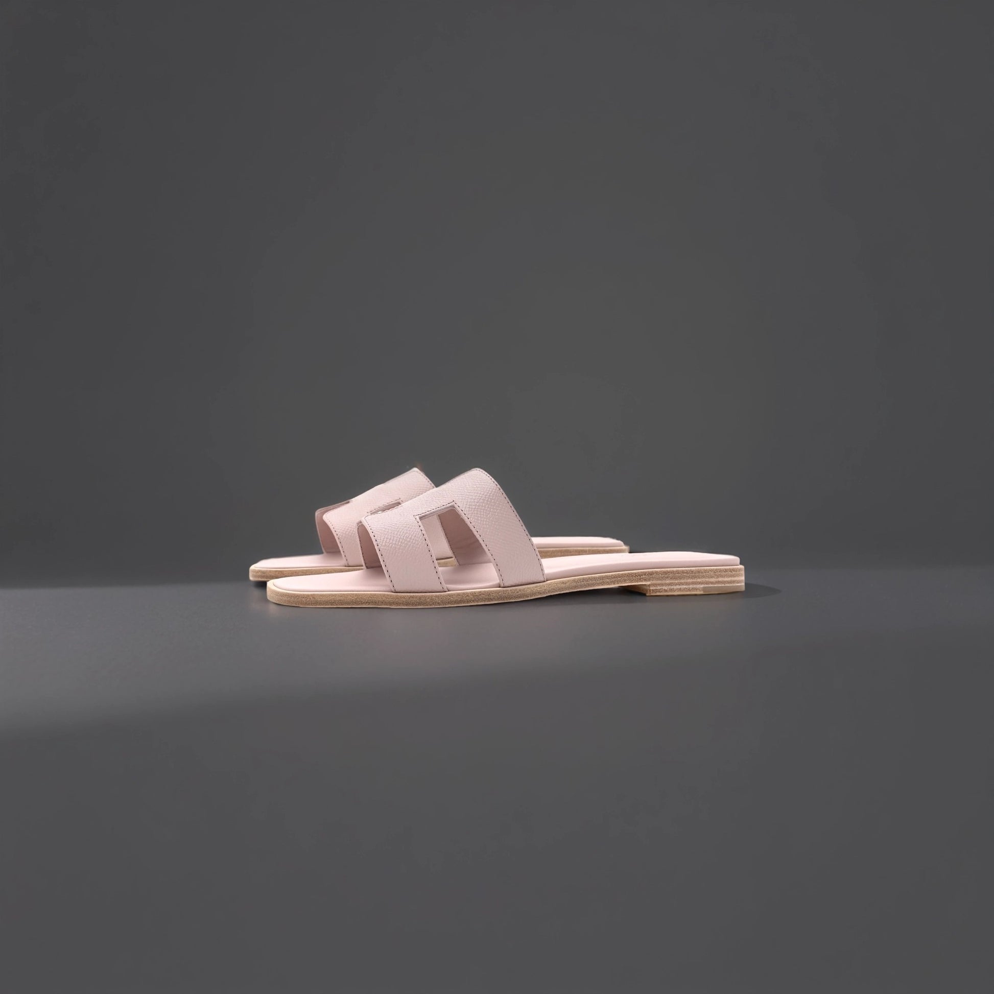 This is an authentic pair of HERMES Epsom Oran Sandals size 40 in Rose Porcelaine. These stylish slippers are crafted of epsom calfskin leather in pink. They feature a toe strap of a cross over large Hermes H.