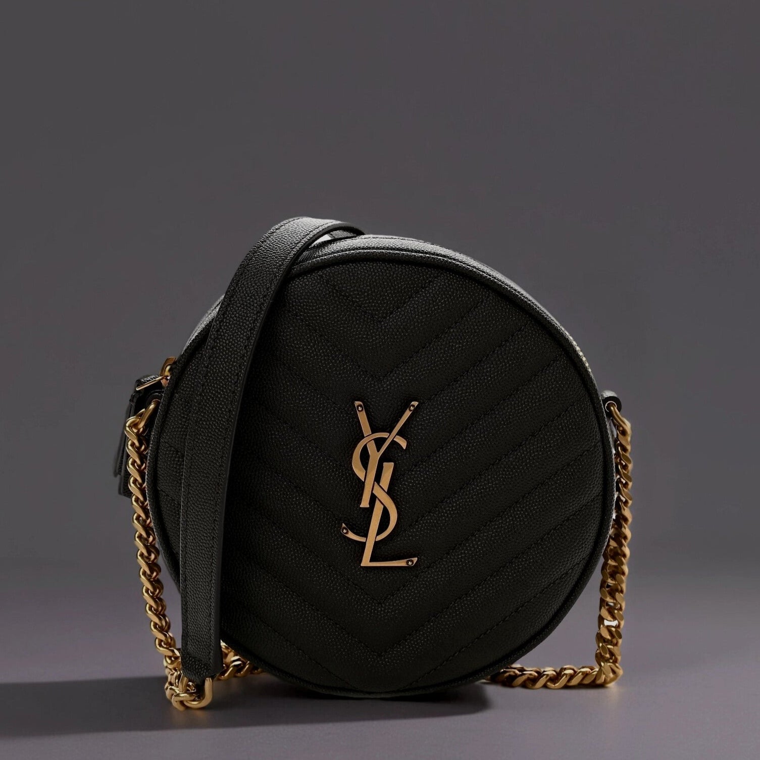 We guarantee this is an authentic SAINT LAURENT Grain De Poudre Matelasse Chevron Quilted Round Vinyle Camera Bag Pebble. This elegant circular crossbody features a chic chevron quilting in dark grey textured leather. The bag features a bijoux aged gold chain-link shoulder strap, top zipper, and a facing prominent YSL monogram logo. The zipper opens to a black fabric interior with a patch pocket.