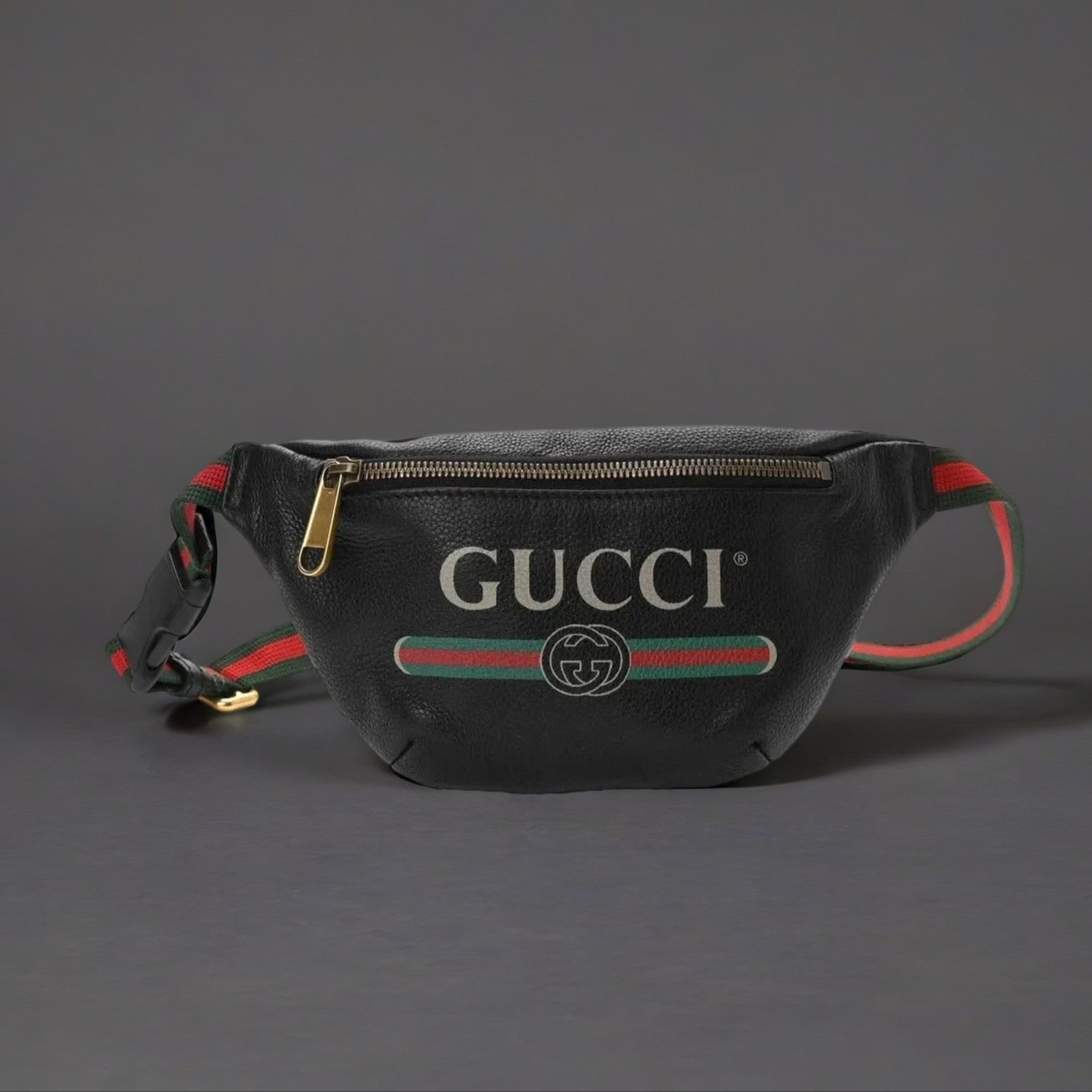 This is an authentic GUCCI Grained Calfskin Small Gucci Print Belt Bag in Black. This belt bag is crafted of black leather with a vintage Gucci logo and an adjustable nylon belt in green and red. The brass zipper opens to a spacious natural fiber interior.
