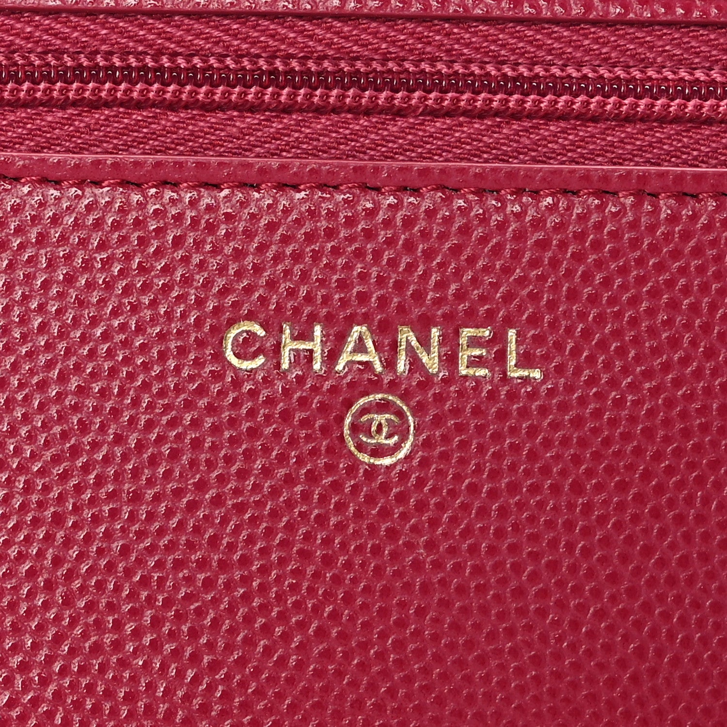 This is an authentic CHANEL Iridescent Caviar Quilted Wallet on Chain WOC in Pink. This stylish wallet on a chain is made of luxuriously textured caviar diamond-quilted leather in iridescent pink. The bag features a waist-length silver chain link leather threaded shoulder strap and a small silver Chanel CC logo on the facing flap. This opens to a pink fabric interior with card slots, zipper, and patch pockets.