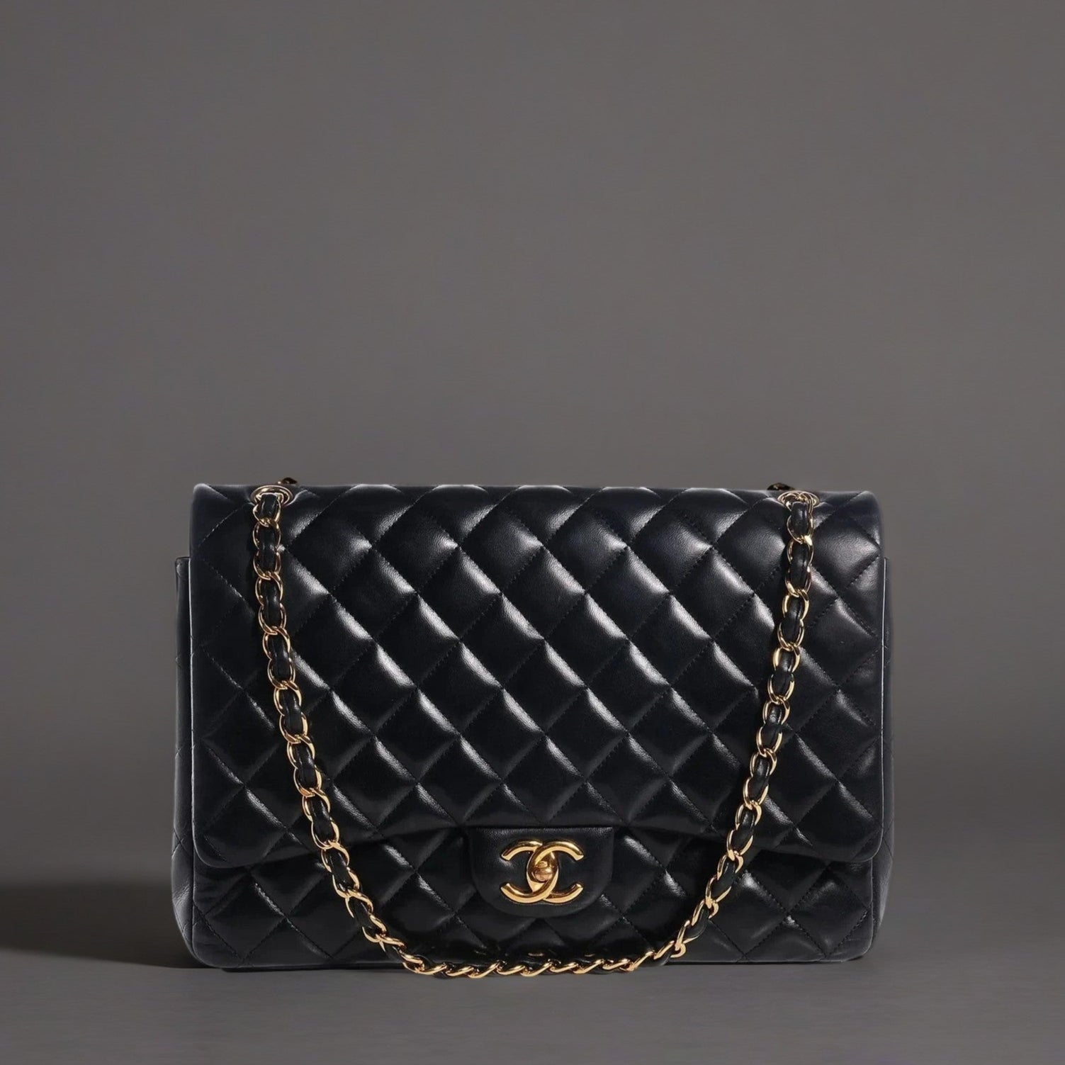 We guarantee this is an authentic CHANEL Lambskin Quilted Maxi Double Flap Black or 100% of your money back. This classic shoulder bag is crafted of luxurious diamond quilted lambskin leather in black. The bag features a rear patch pocket, polished silver chain link leather threaded shoulder straps and a full front flap with a silver Chanel CC turn lock. This popular handbag has a second flap that opens to a spacious bordeaux leather interior with patch pockets. This is the perfect flap bag for all of your day and evening necessities with the classic style of Chanel.
