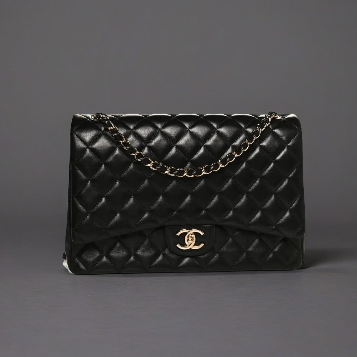 This is an authentic CHANEL Lambskin Quilted Maxi Double Flap in Black. This classic shoulder bag is crafted of luxurious diamond quilted lambskin leather in black. The bag features a rear patch pocket, a gold chain-link leather threaded shoulder strap, and a full front flap with a classic gold Chanel CC turn-lock. This opens to reveal an inner flap and a spacious burgundy leather interior with patch pockets.