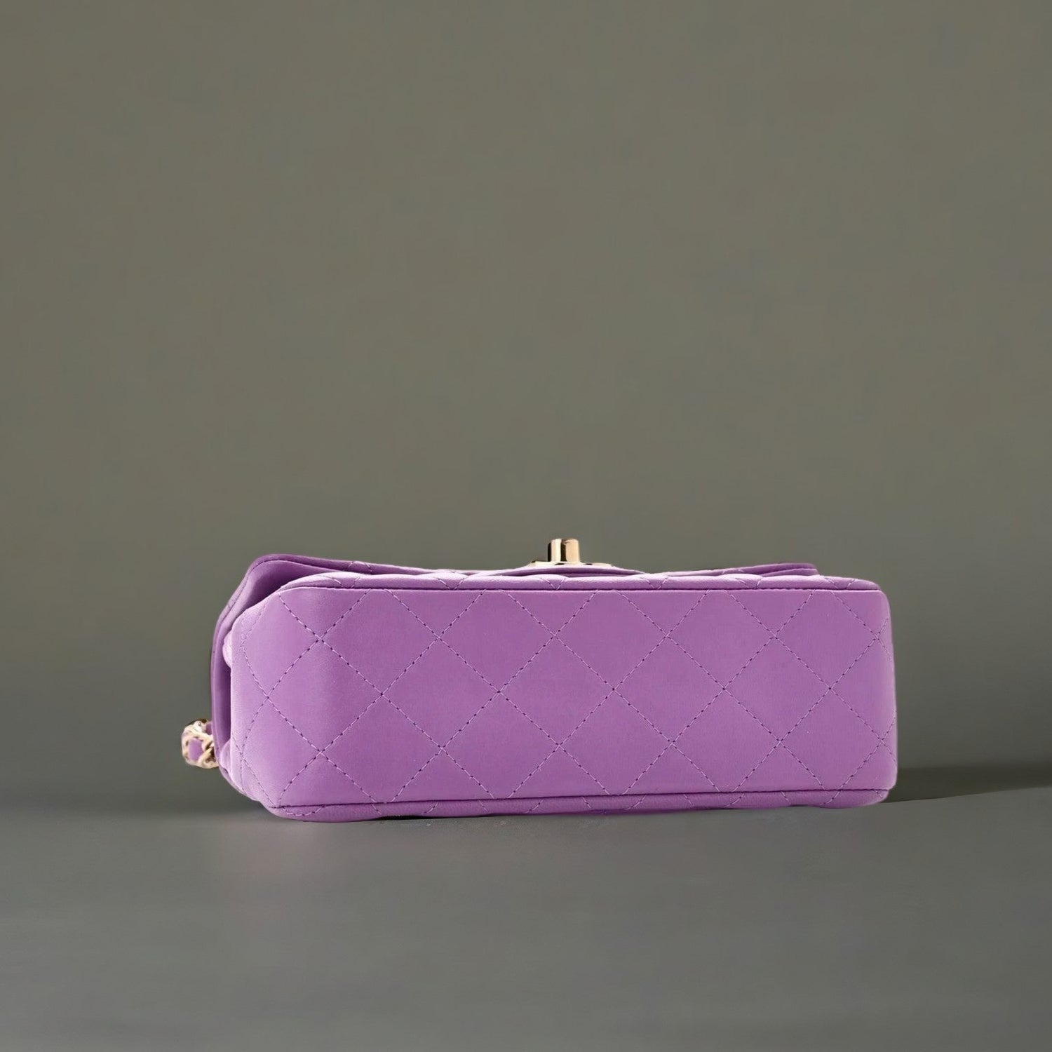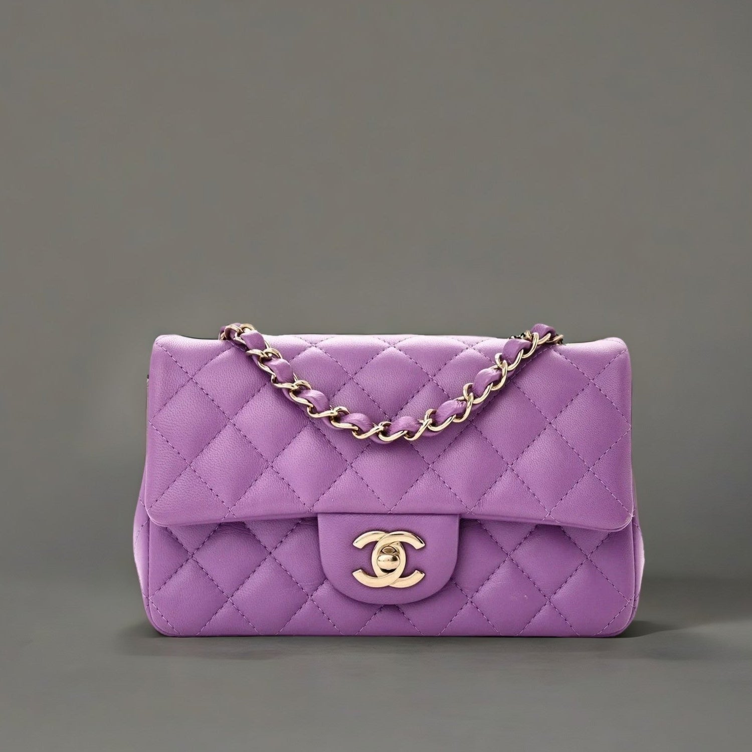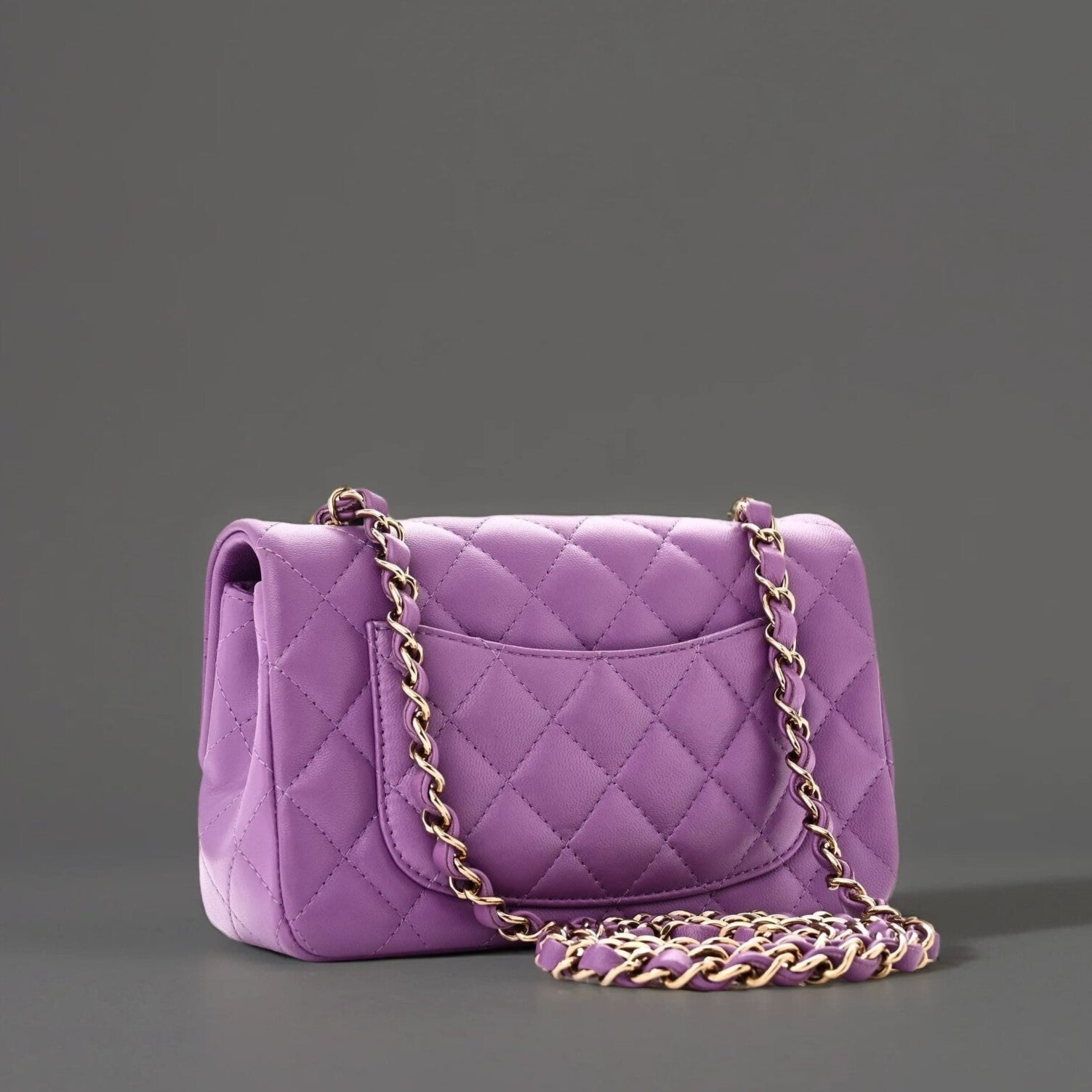 This is an authentic CHANEL Lambskin Quilted Mini Rectangular Flap in Purple. The petite shoulder bag is crafted of diamond-quilted lambskin leather in violet purple. The bag features a leather-threaded polished gold chain-link shoulder strap and a matching gold classic CC turn-lock on the crossover flap. This opens the bag to a smooth purple leather interior with zipper and patch pockets.