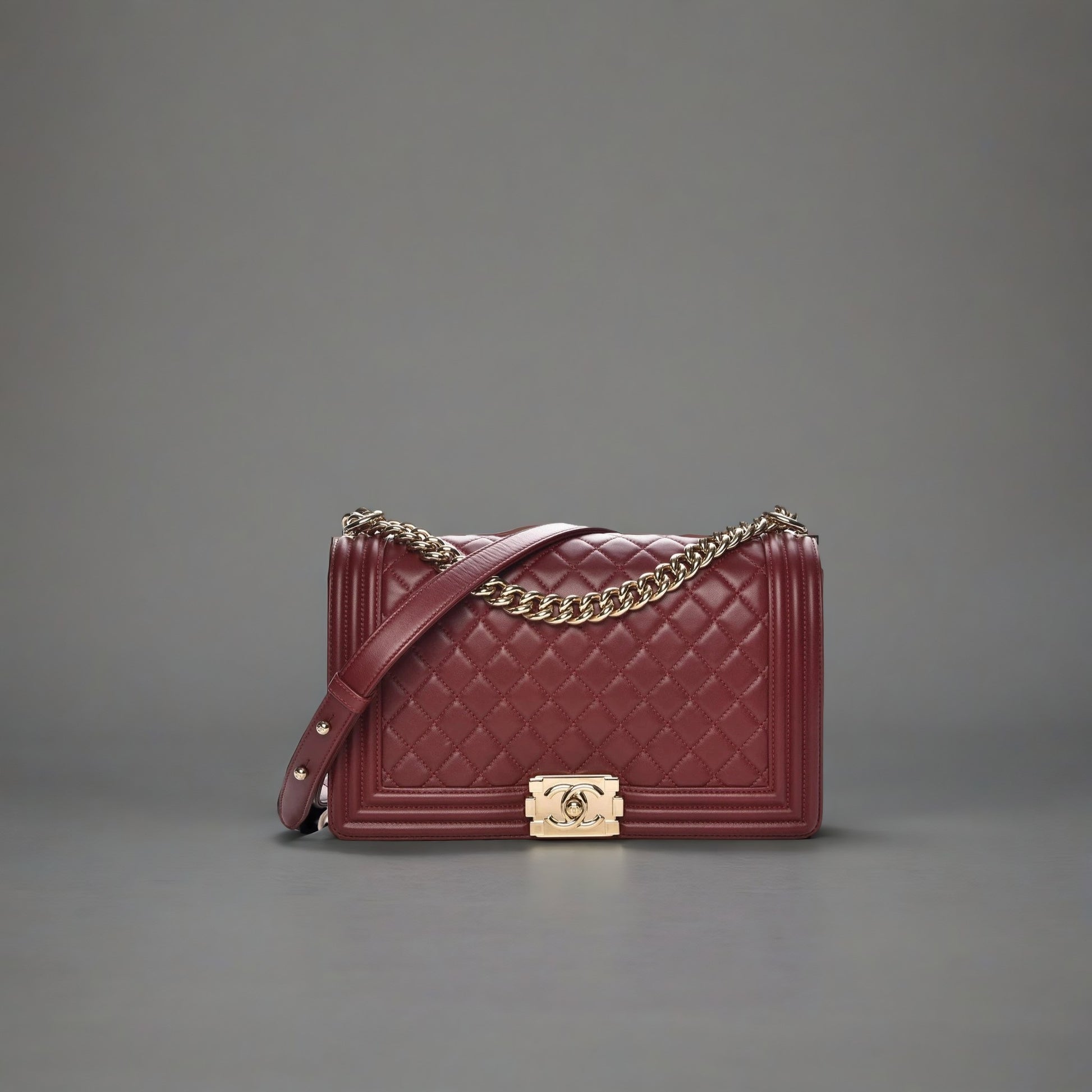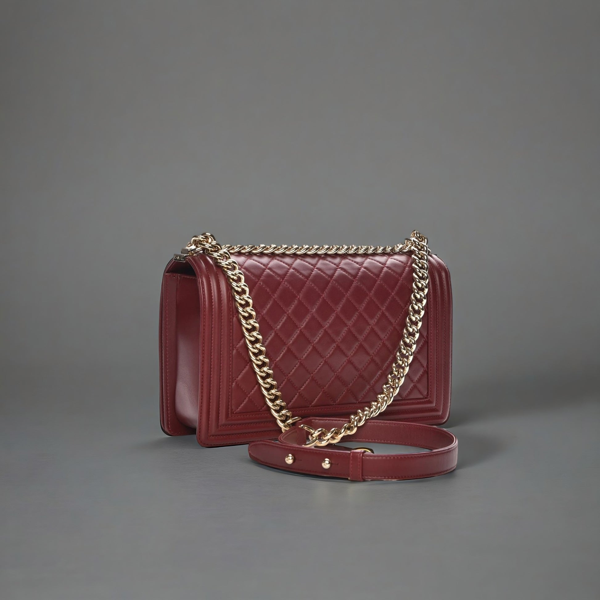 We guarantee this is an authentic CHANEL Lambskin Quilted New Medium Boy Flap Dark Red. This chic shoulder bag is crafted of diamond quilted luxurious lambskin leather with a linear quilted border in a deep red. The bag features gold hardware, a chain link shoulder strap with a leather shoulder pad and a squared Boy Chanel CC press lock. This opens the front flap to a red fabric interior with zipper and patch pockets. This is an excellent shoulder bag, ideal for day and evening use, from Chanel.