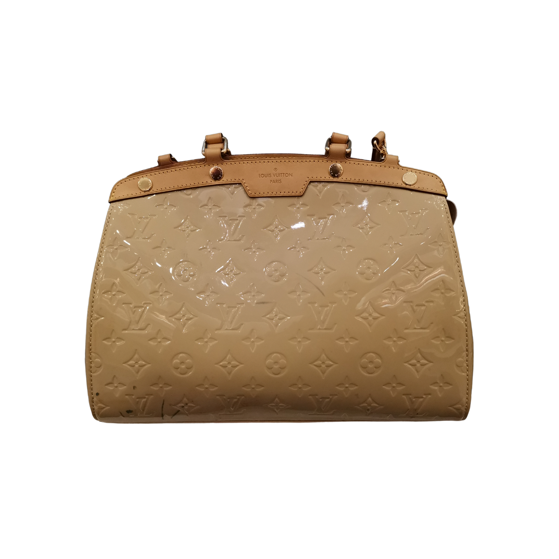 We guarantee this is an authentic LOUIS VUITTON Vernis Brea MM Dune . This sophisticated tote is crafted of beige monogram-embossed patent leather with vachetta leather handles, leather trim, and brass hardware. The top zipper opens to interior of beige canvas with zipper and patch pockets. Without strap. This is an ideal everyday bag from Louis Vuitton!