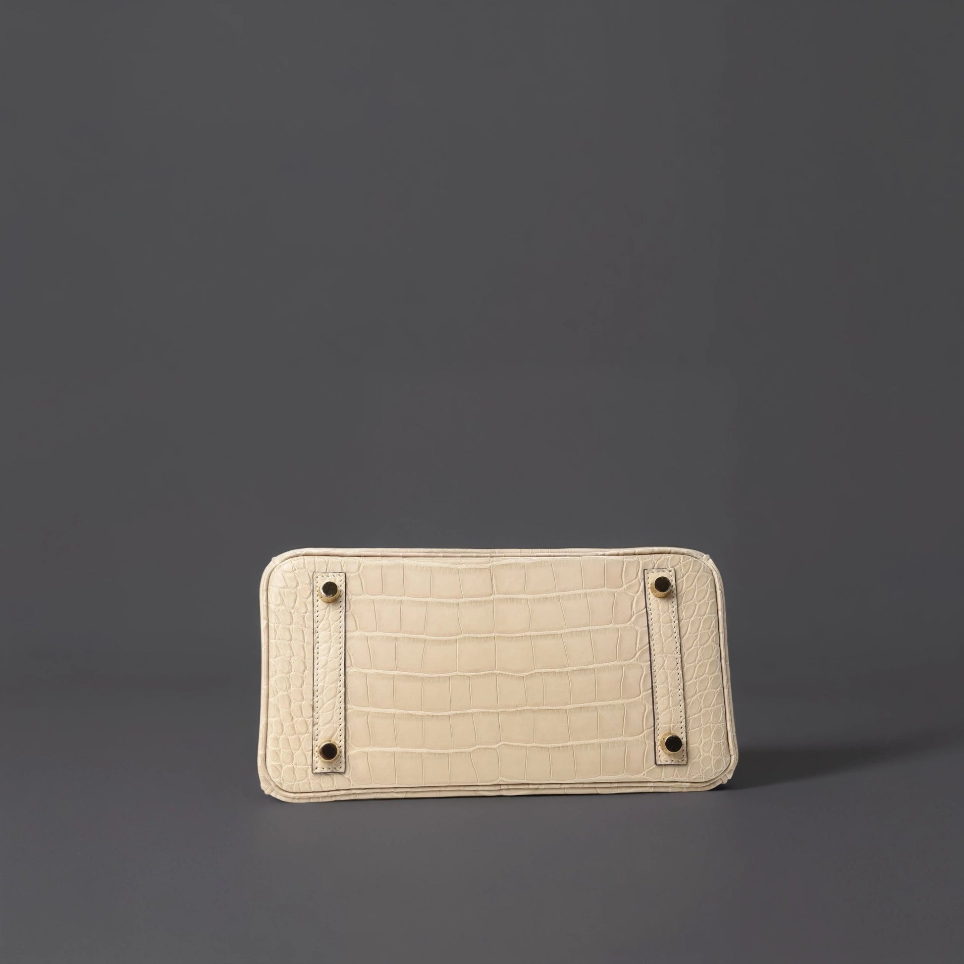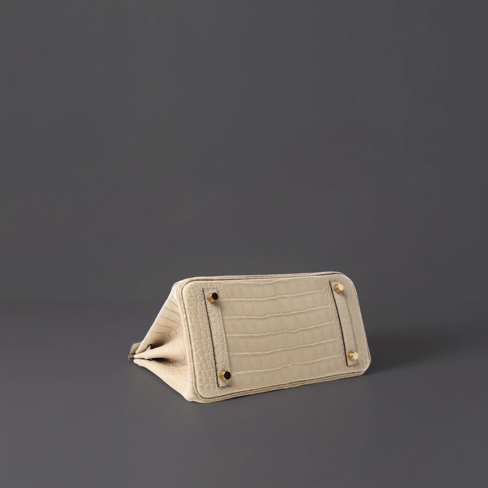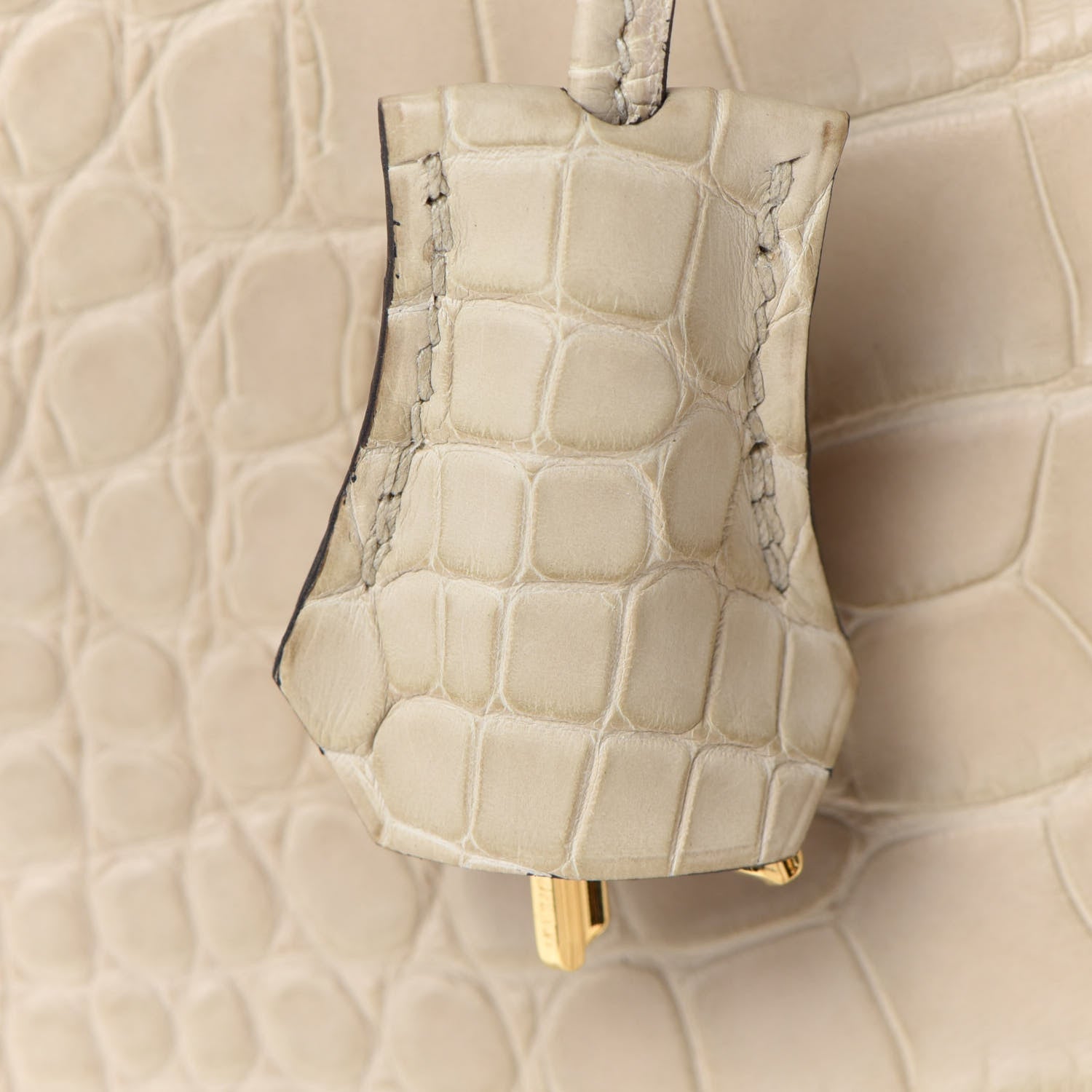 This is the authentic HERMES Matte Alligator Birkin 25 Trench. This stunning classic Birkin handbag tote is crafted of matte crocodile in classic beige. This popular bag features rolled top handles and a cross-over flap with strap closure and a gold turn-lock with a crocodile wrapped gold padlock and a hanging clochette with keys. These open to a chevre goatskin matte leather interior.