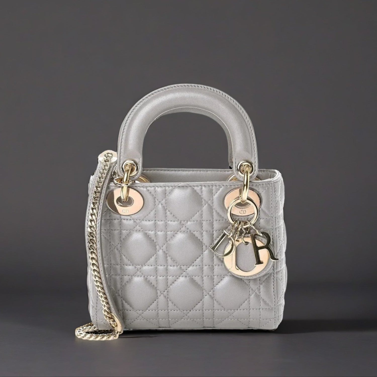 Metallic Lambskin Cannage Mini Lady Dior Grey