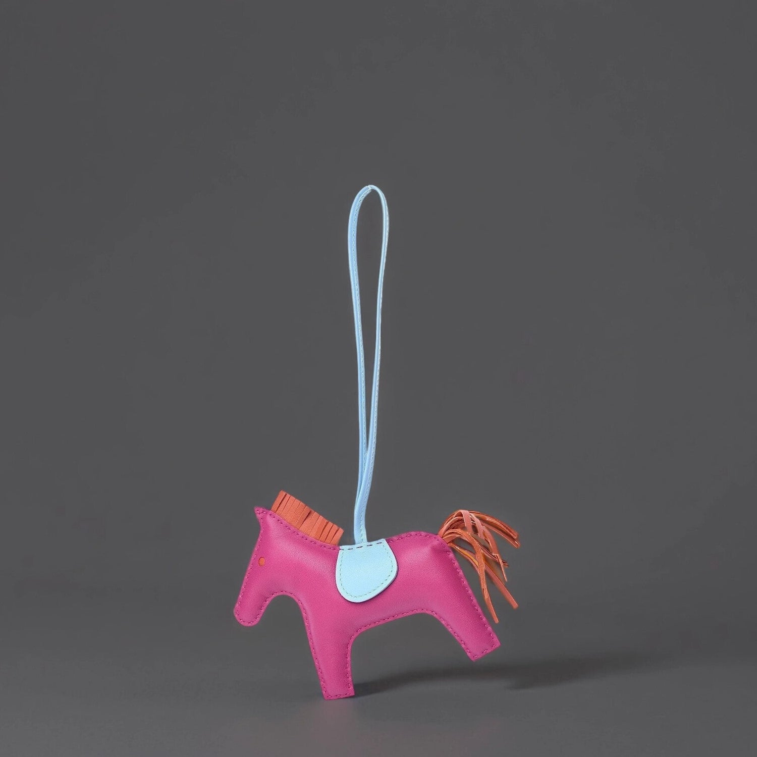 This is an authentic HERMES Milo Lambskin Grigri Rodeo Horse Bag Charm MM in Rose Pourpre, Cornaline, and Celeste. This lovely bag charm is crafted of stuffed purple lambskin leather in the shape of a horse with an orange fringe mane and tail on a blue leather strap. This is an excellent bag charm that is truly charming, from Hermes.