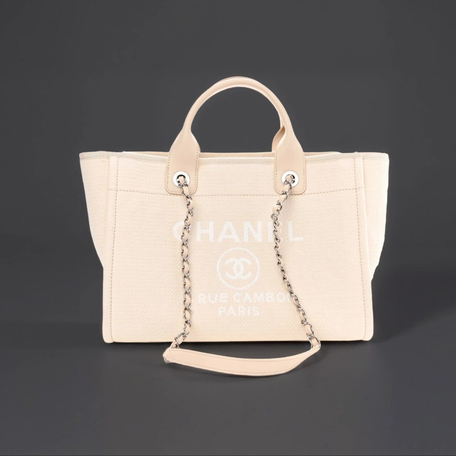 This is an authentic CHANEL Mixed Fibers Small Deauville Tote in White. This stylish shoulder bag is crafted of tightly woven fibers in off white, with a Chanel Rue Cambon Paris logo on the front. The bag features beige fabric trim, and fabric-threaded polished silver chain link shoulder straps. The top is open to a beige fabric interior with zipper and patch pockets and a removable pouch.