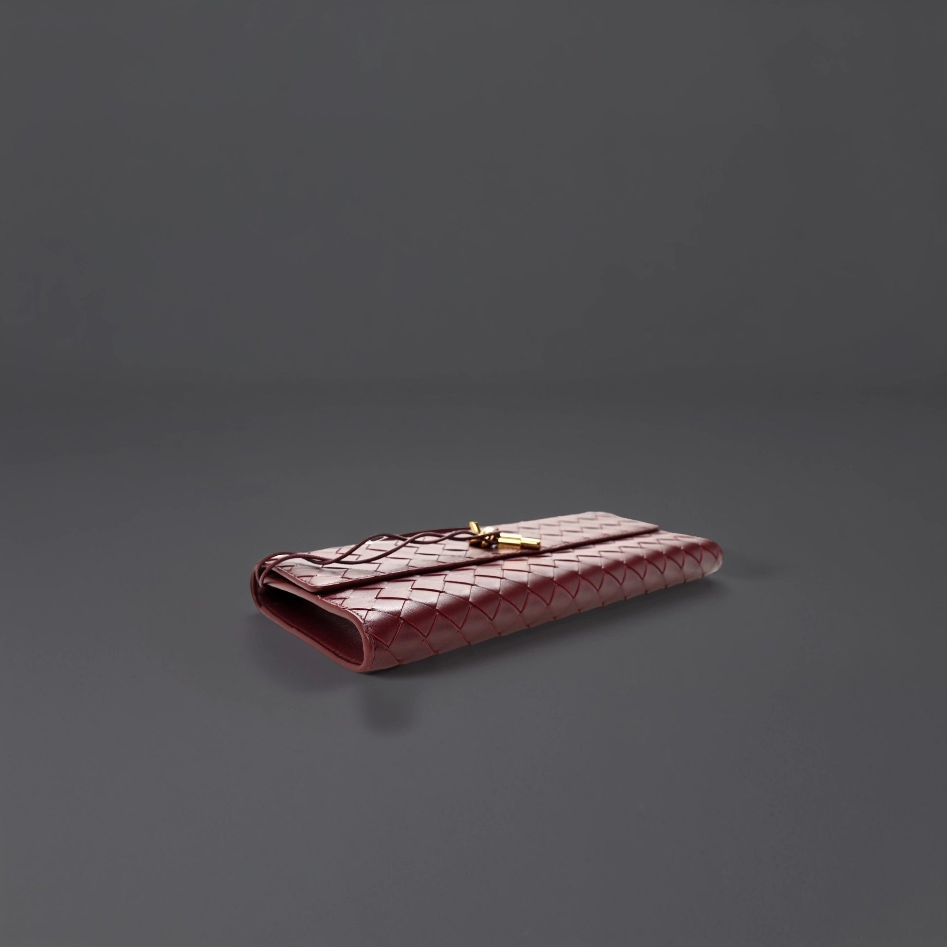 This is an authentic BOTTEGA VENETA Nappa Intrecciato Long Andiamo Top Handle Clutch in Barolo. This stylish bag is crafted of Burgundy nappa leather. It features a leather top handle and a gold-tone knot detail at the front. The flap opens to a leather interior with a patch pocket and card slots.