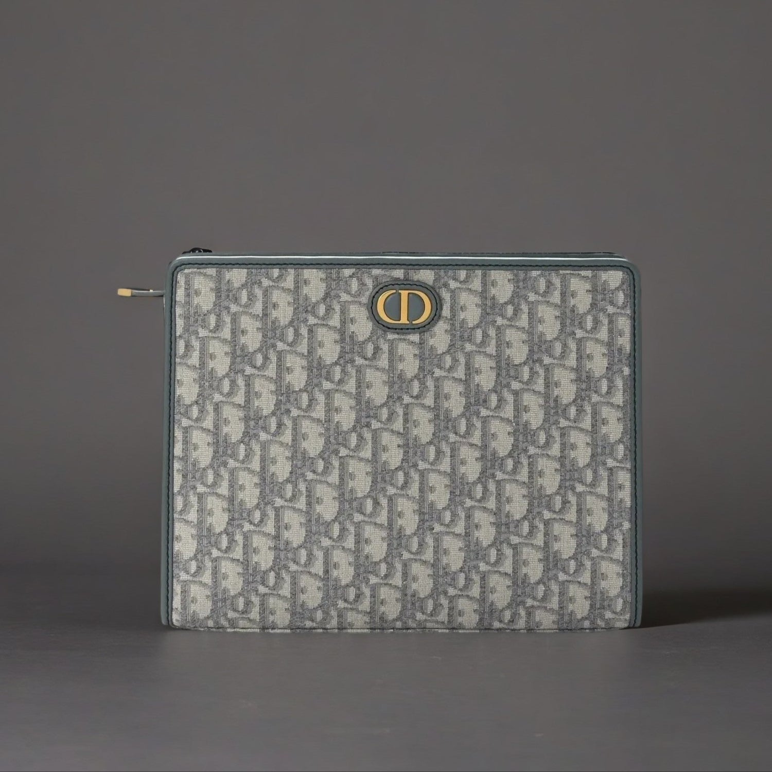 This is an authentic CHRISTIAN DIOR Oblique 30 Montaigne Pouch in Grey. This stylish beauty pouch is crafted of grey on beige Dior monogram canvas and features an antique gold finish "CD" signature on the front. The top zipper opens to a beige fabric interior with a patch pocket and card slots.