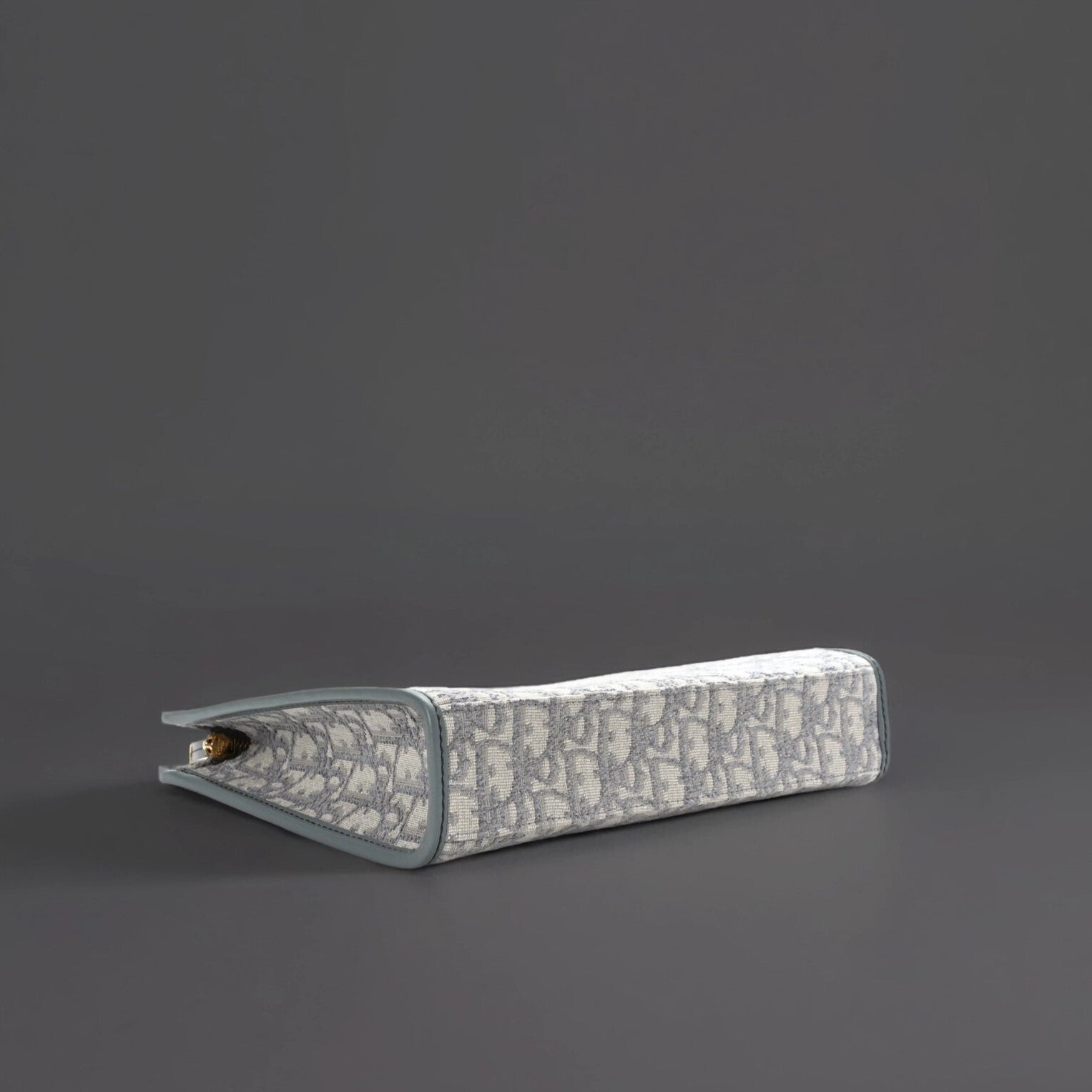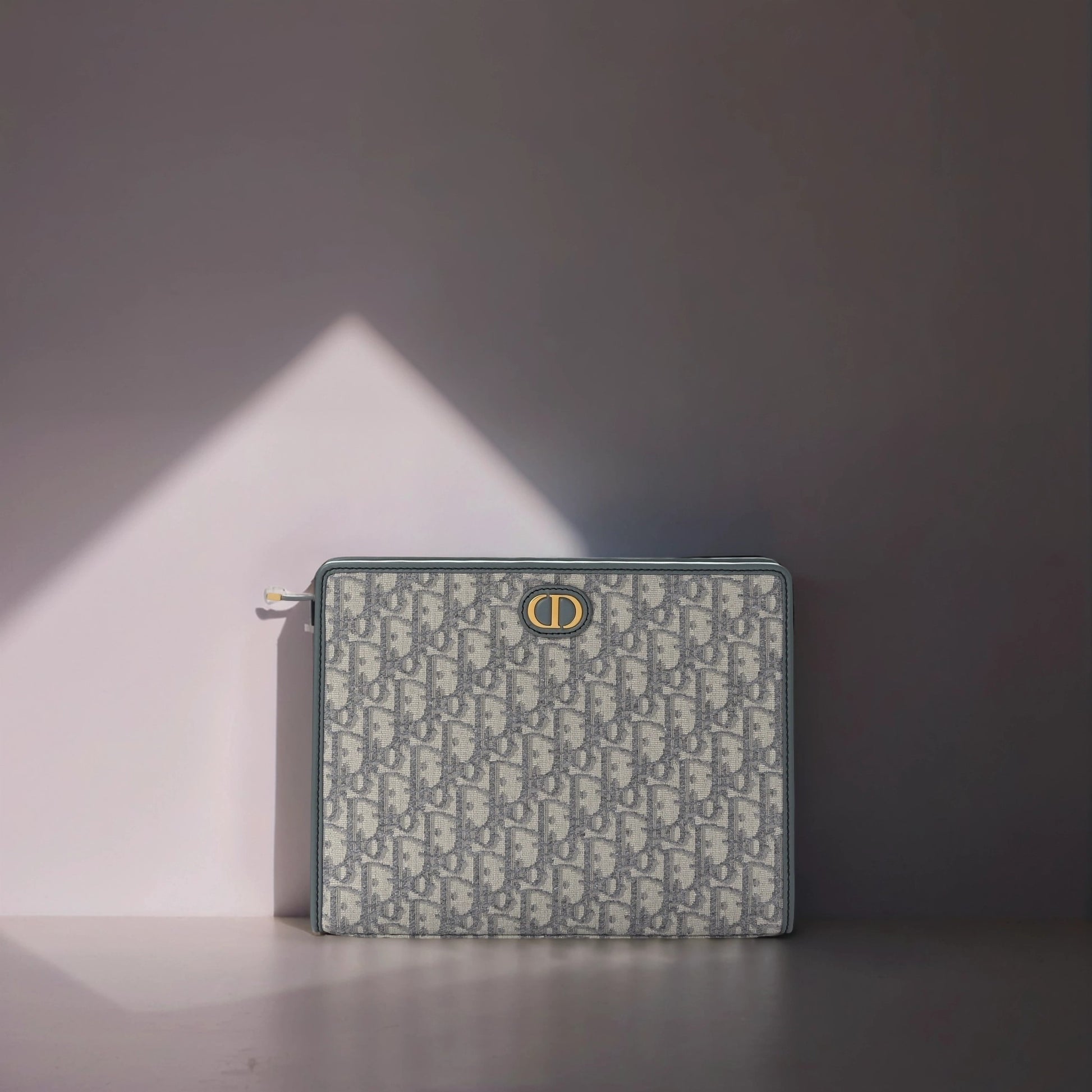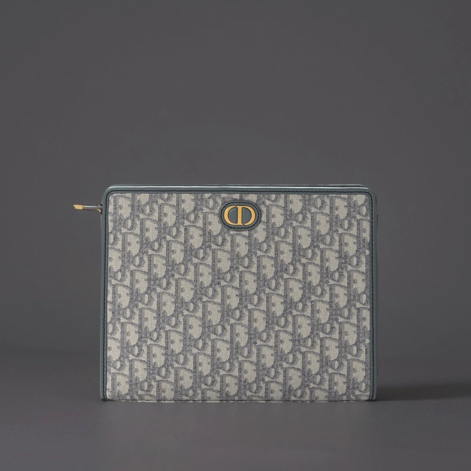 This is an authentic CHRISTIAN DIOR Oblique 30 Montaigne Pouch in Grey. This stylish beauty pouch is crafted of grey on beige Dior monogram canvas and features an antique gold finish "CD" signature on the front. The top zipper opens to a beige fabric interior with a patch pocket and card slots.