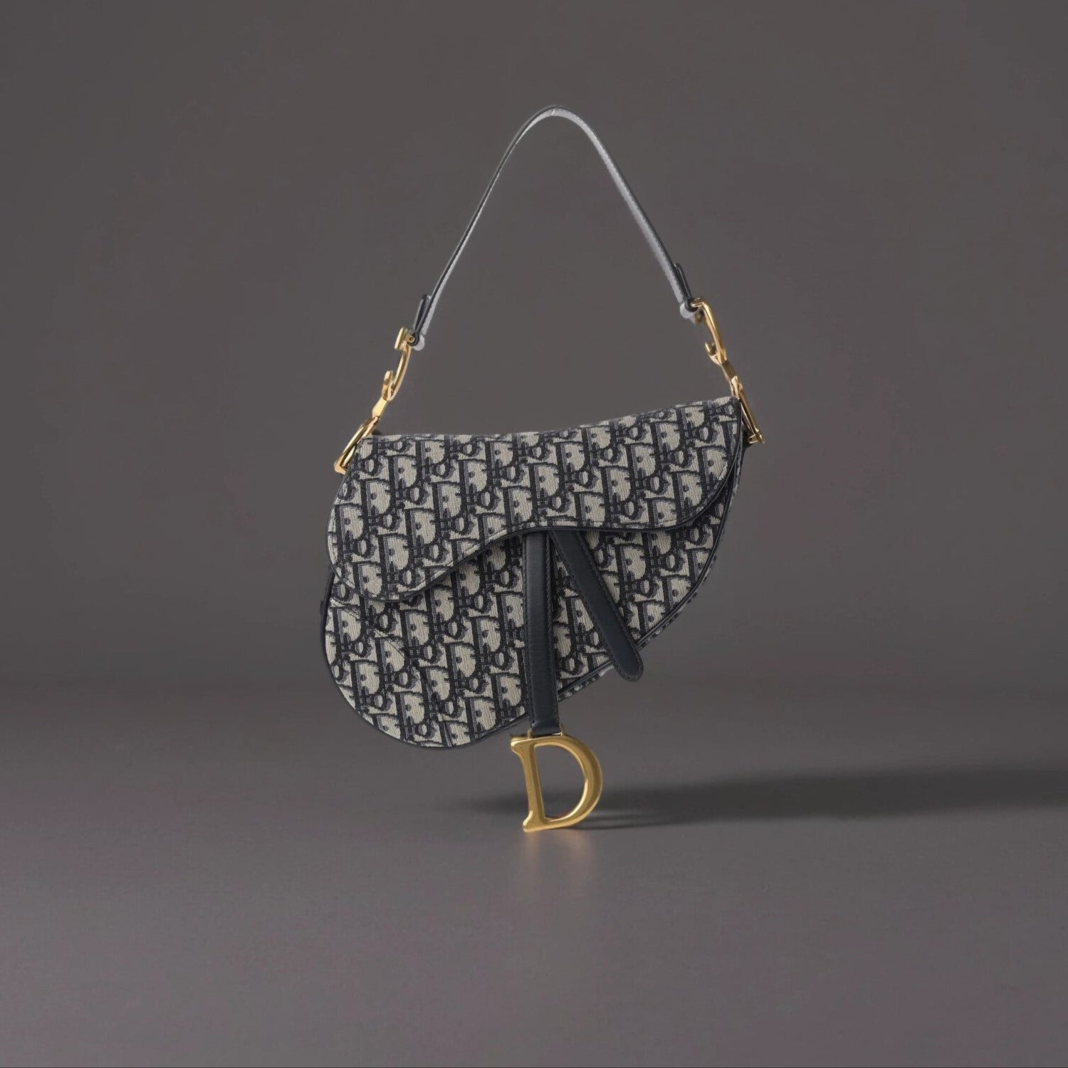 This is an authentic CHRISTIAN DIOR Oblique Saddle Bag in Blue. This shoulder bag is made of navy on beige Dior monogram canvas. The bag features blue cowhide leather trim, a leather handle, and brass hardware. The flap opens to a beige fabric interior with a zipper pocket.