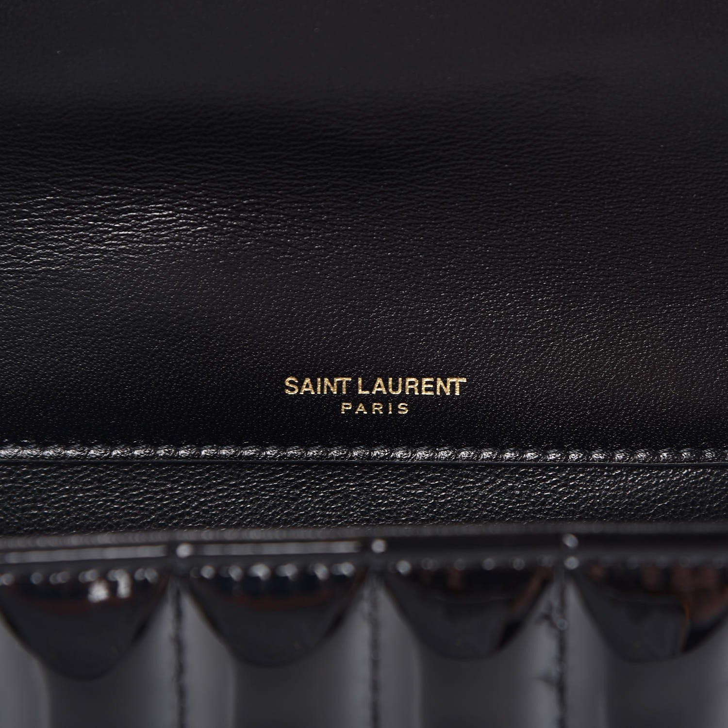This is an authentic SAINT LAURENT Patent Matelasse Monogram Large Vicky Chain Bag in Black. This elegant shoulder bag features chic patent lined quilting in black. The bag features a gold chain link shoulder strap with a matching leather shoulder pad. The front flap features a prominent gold YSL monogram detail and opens to a black leather interior with a patch pocket. This is an ideal bag for your collection for day or evening, with the classic chic only from Yves Saint Laurent.