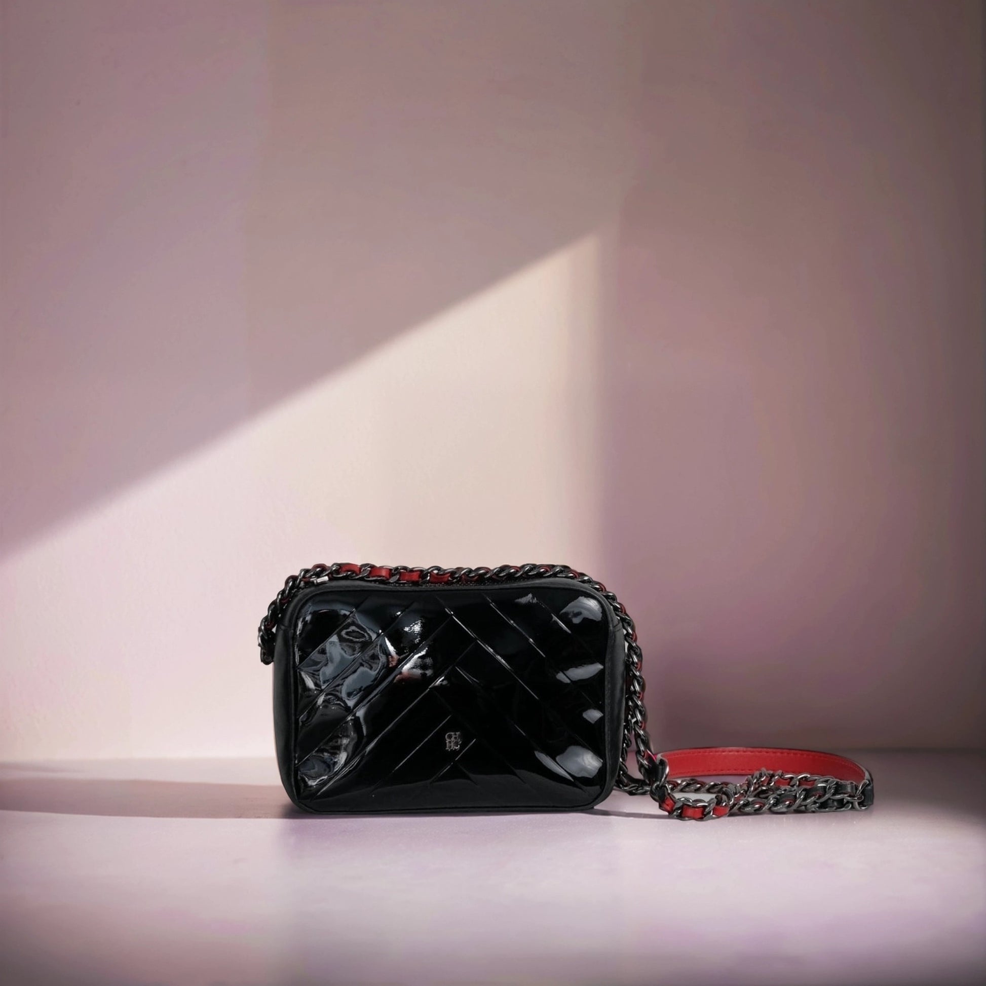 We guarantee this is an authentic carolina herrera Patent Quilted Tassel Camera Case Black . The bold features and exceptional quality of this vintage carolina herrera shoulder bag lend a classic elegance for day or evening. The bag is a mini size shoulder bag and is a structured case of sturdy diamond quilted patent leather. The bag has a carolina herrera logo There is a lengthy dark gray shoulder chain threaded with silver leather and a gold knobbed leather tassel zipper pull. The bag opens to an interior of matte black leather with zipper and patch pockets. This is an excellent vintage shoulder bag that is ideal as an everyday bag and also chic for entertainment and socializing that calls for the special touch of the timeless quality and style you can rely on, from carolina herrera.
