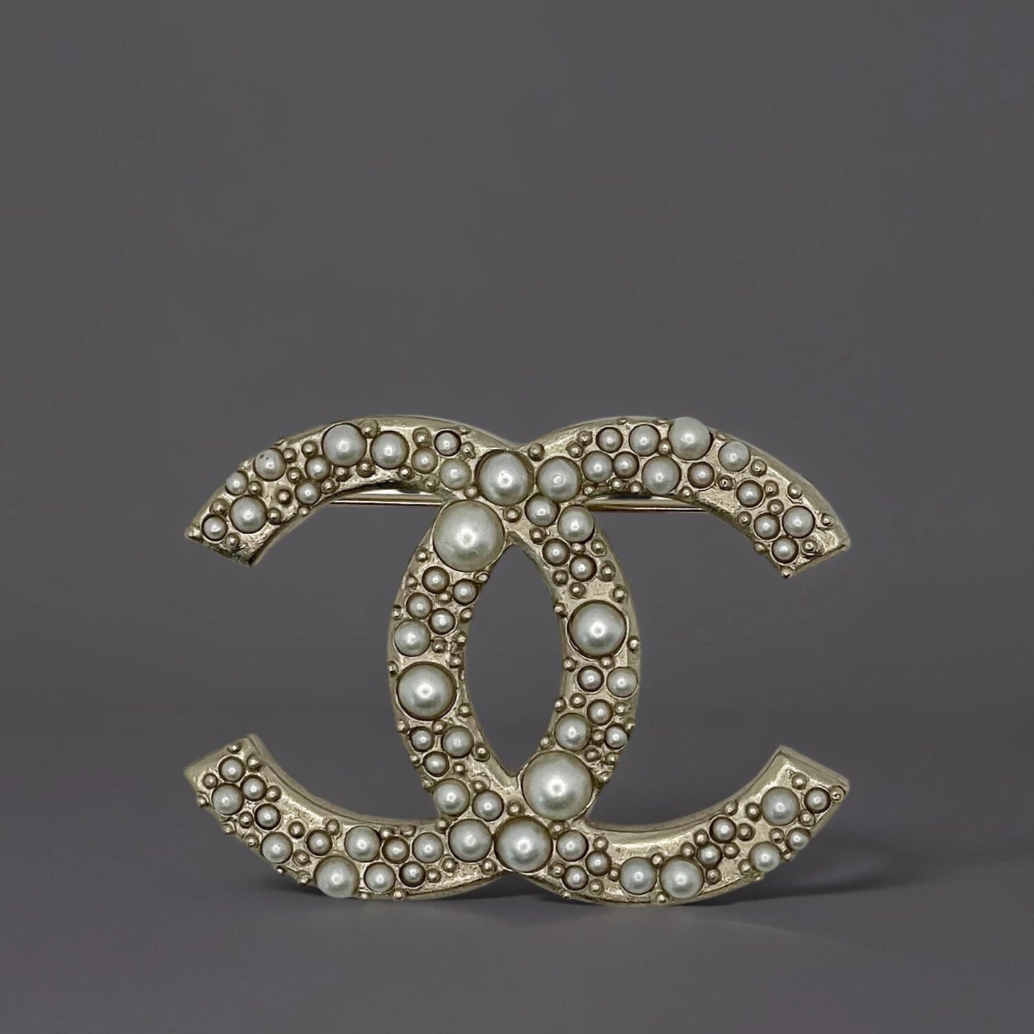 This is an authentic CHANEL Pearl CC Brooch . This stunning brooch is in a pearl gold tone Chanel CC logo and laid with small and medium pearls. This is a lovely brooch with the timeless style only from Chanel.