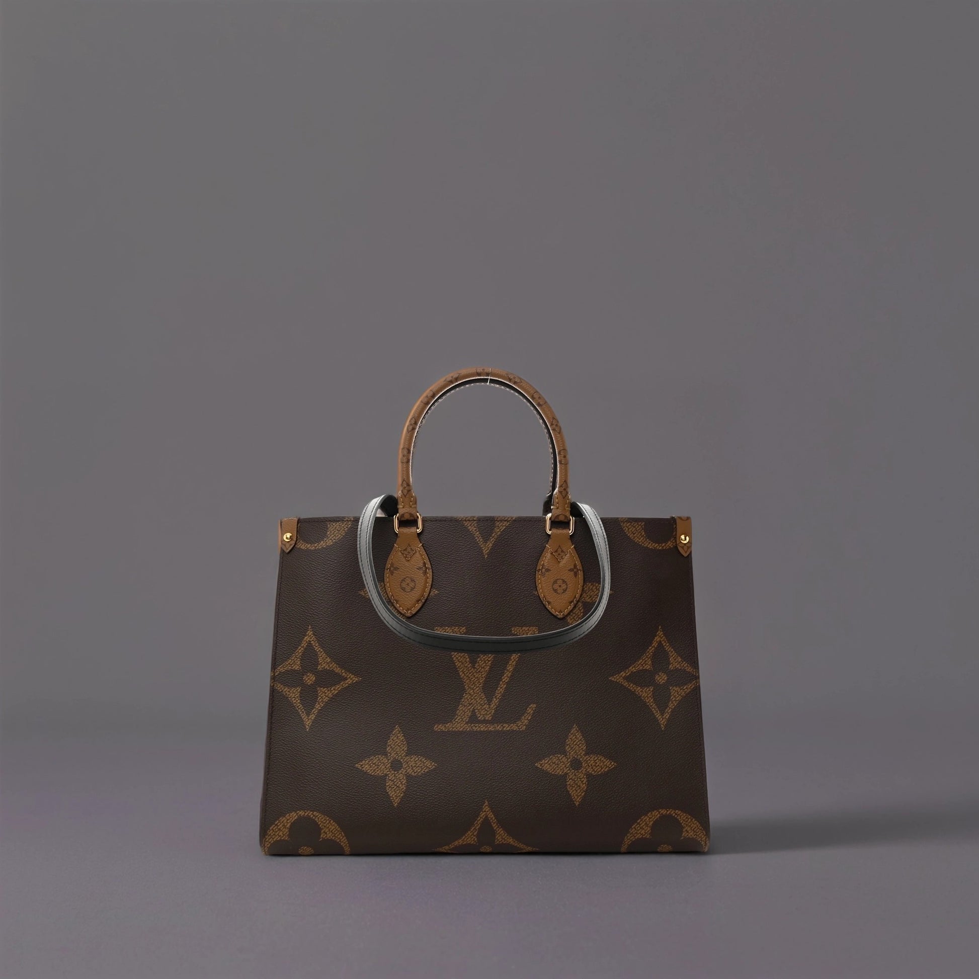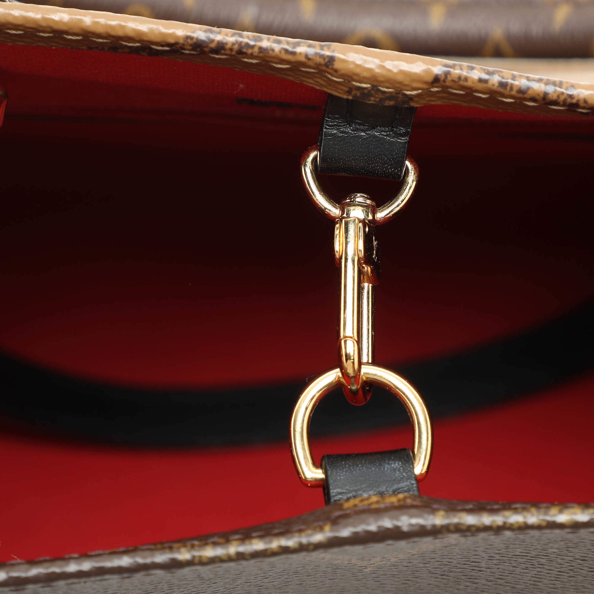 This is an authentic LOUIS VUITTON Reverse Monogram Giant Onthego MM. This limited edition tote features oversized and smaller versions of the classic Louis Vuitton monogram printed in brown on coated canvas in beige. The bag features rolled top handles and long shoulder straps that can be tucked away inside the bag, accented with polished brass hardware. The top is open to a spacious red fabric interior with zipper and patch pockets.