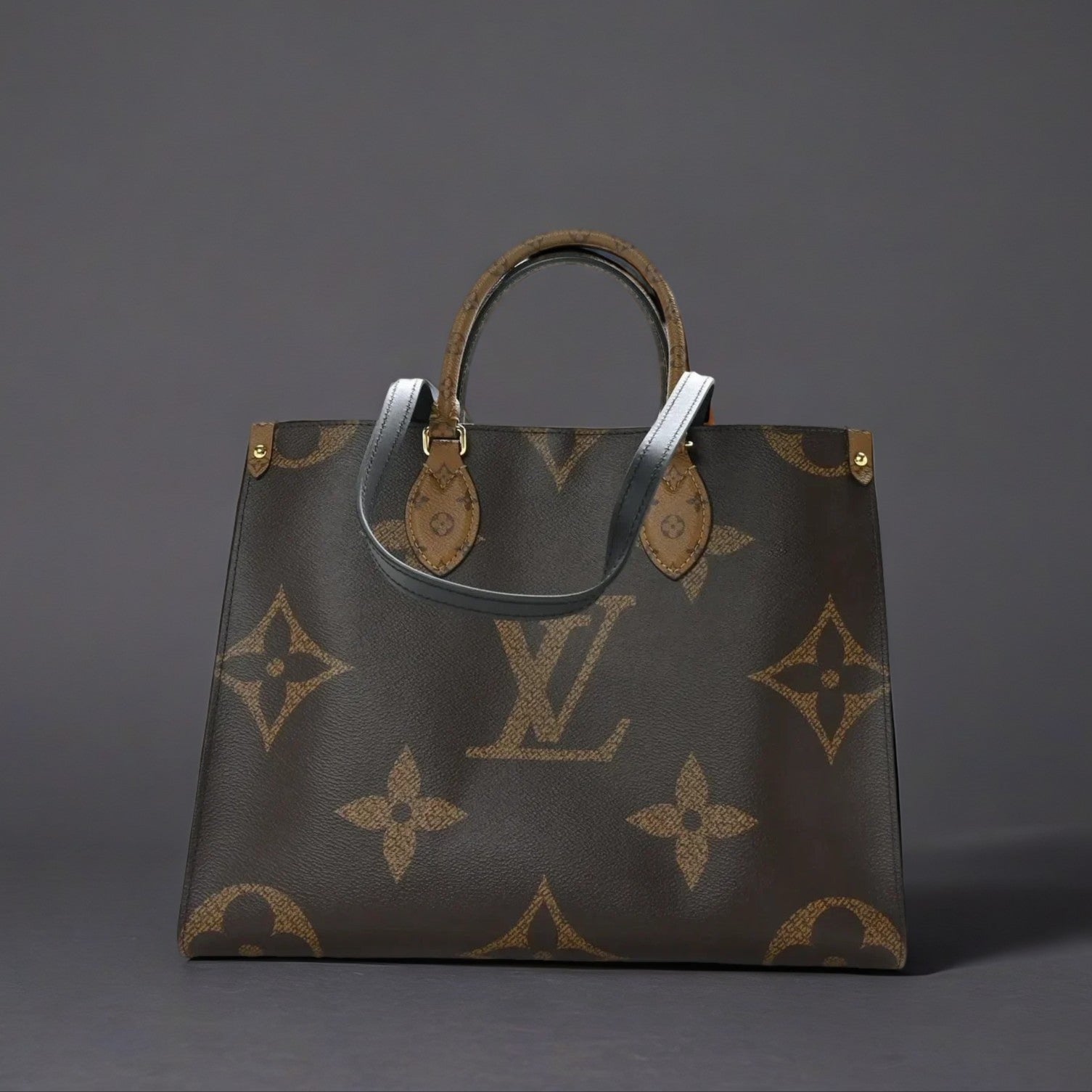 This is an authentic LOUIS VUITTON Reverse Monogram Giant Onthego MM. This limited edition tote features oversized and smaller versions of the classic Louis Vuitton monogram printed on coated canvas in brown. The bag features rolled top handles and long shoulder straps that can be tucked away inside the bag, accented with polished brass hardware. The top is open to a spacious red fabric interior with zipper and patch pockets.