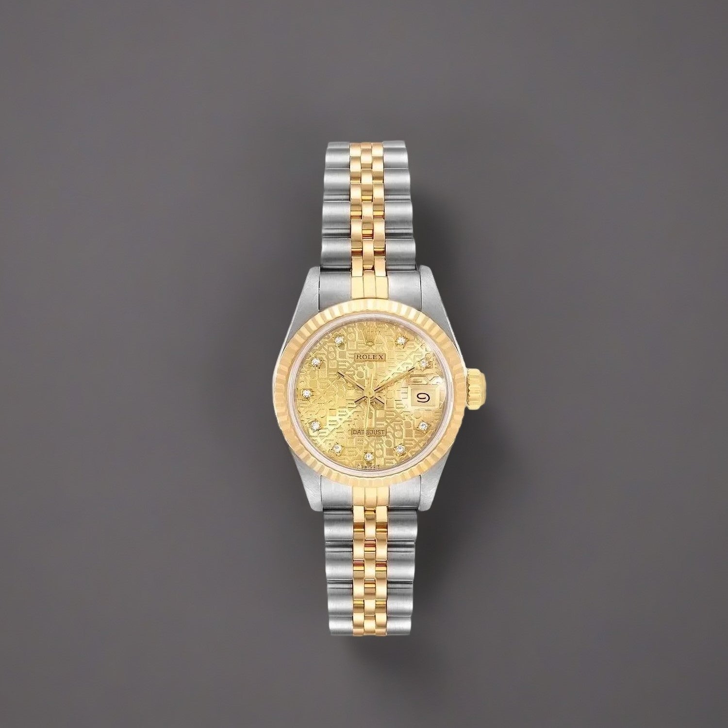 Rolex Datejust 26 Steel Yellow Gold Diamond Dial Ladies Watch. Stainless steel oyster case 26 mm in diameter. Rolex logo on a crown. 18k yellow gold fluted bezel. Scratch resistant sapphire crystal with cyclops magnifier. Champagne jubilee anniversary dial with original Rolex factory diamond hour markers. Date calendar at 3 o'clock aperture. Stainless steel and 18k yellow gold jubilee bracelet with fold over clasp.