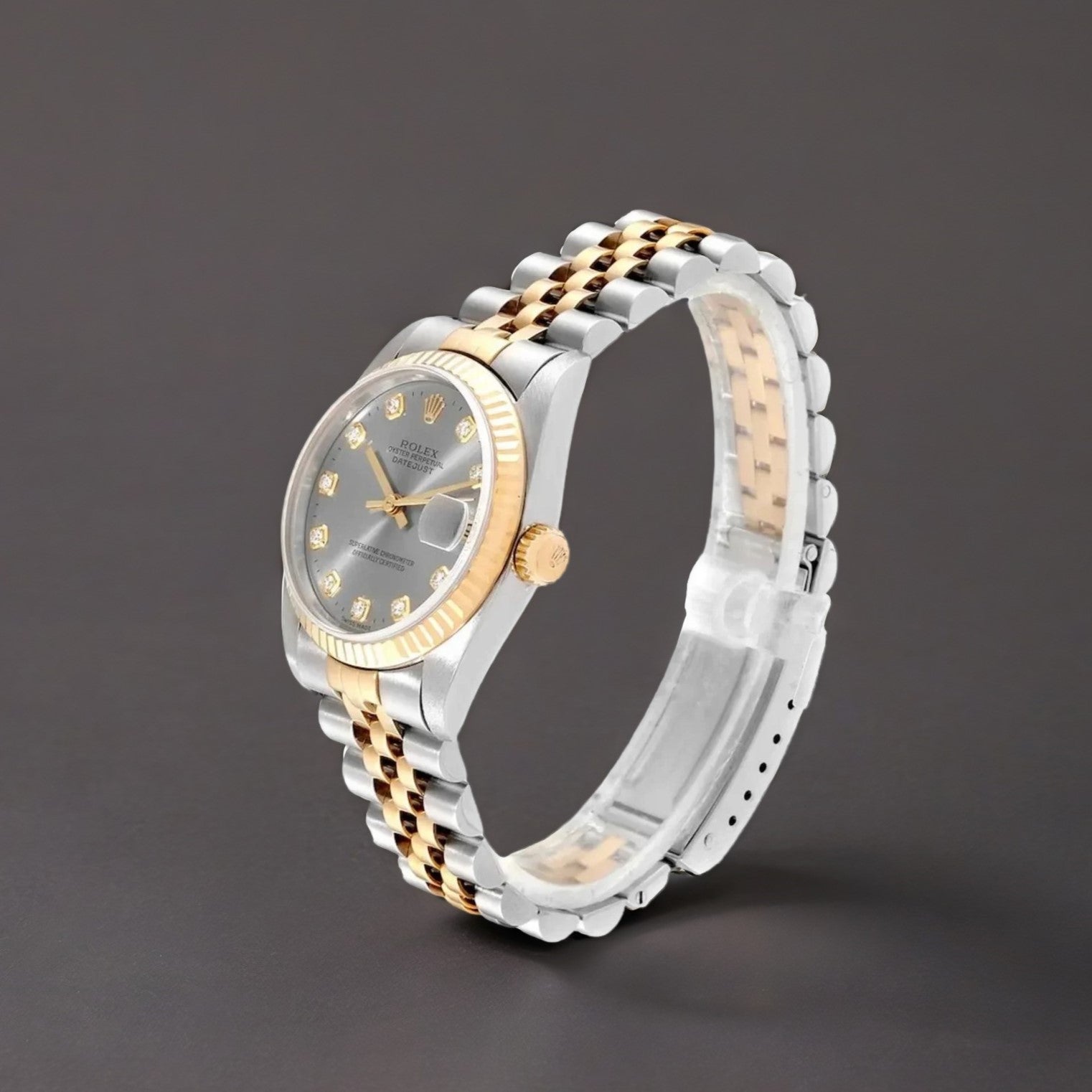 Rolex Datejust Steel Yellow Gold Slate Diamond Dial. Stainless steel oyster case 26 mm in diameter. Rolex logo on the crown. 18k yellow gold fluted bezel. Scratch resistant sapphire crystal with cyclops magnifier. Slate jubilee anniversary dial with original Rolex factory diamond hour markers. Date calendar at 3 o'clock aperture. Stainless steel and 18k yellow gold Jubilee bracelet with fold over clasp.