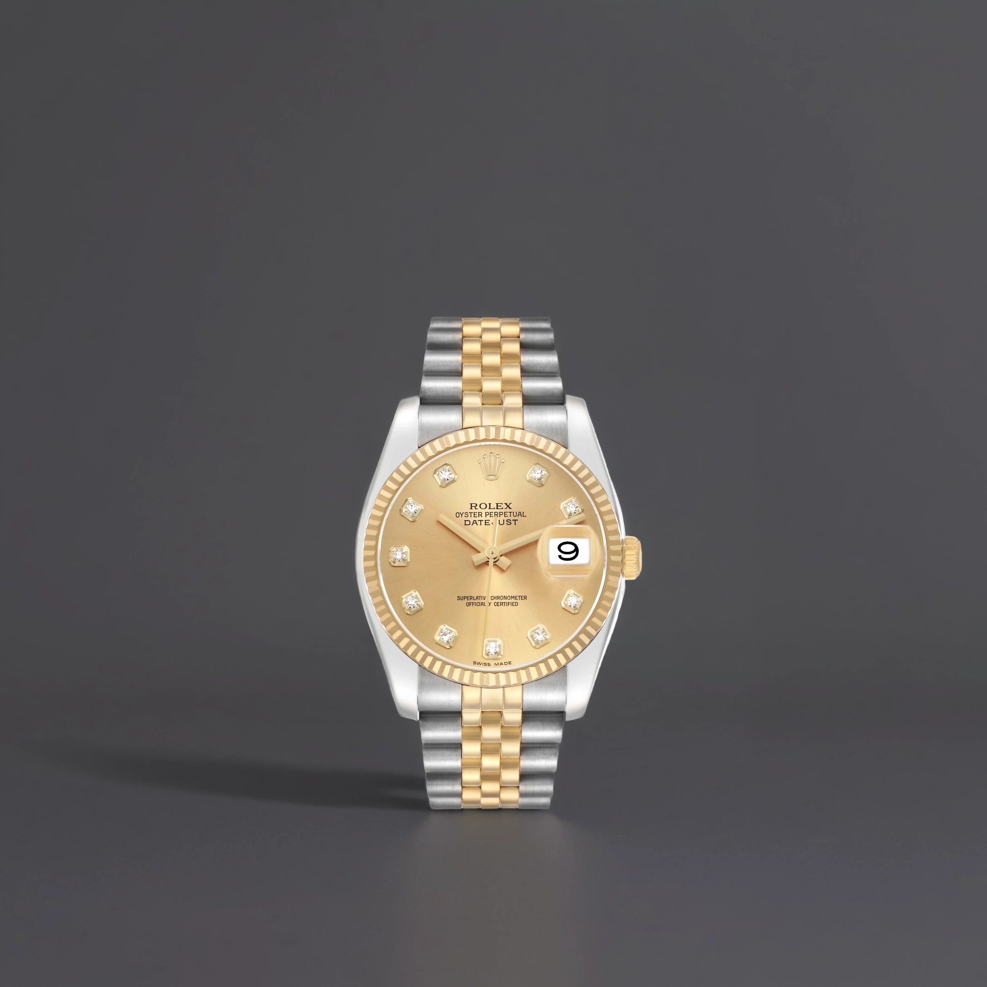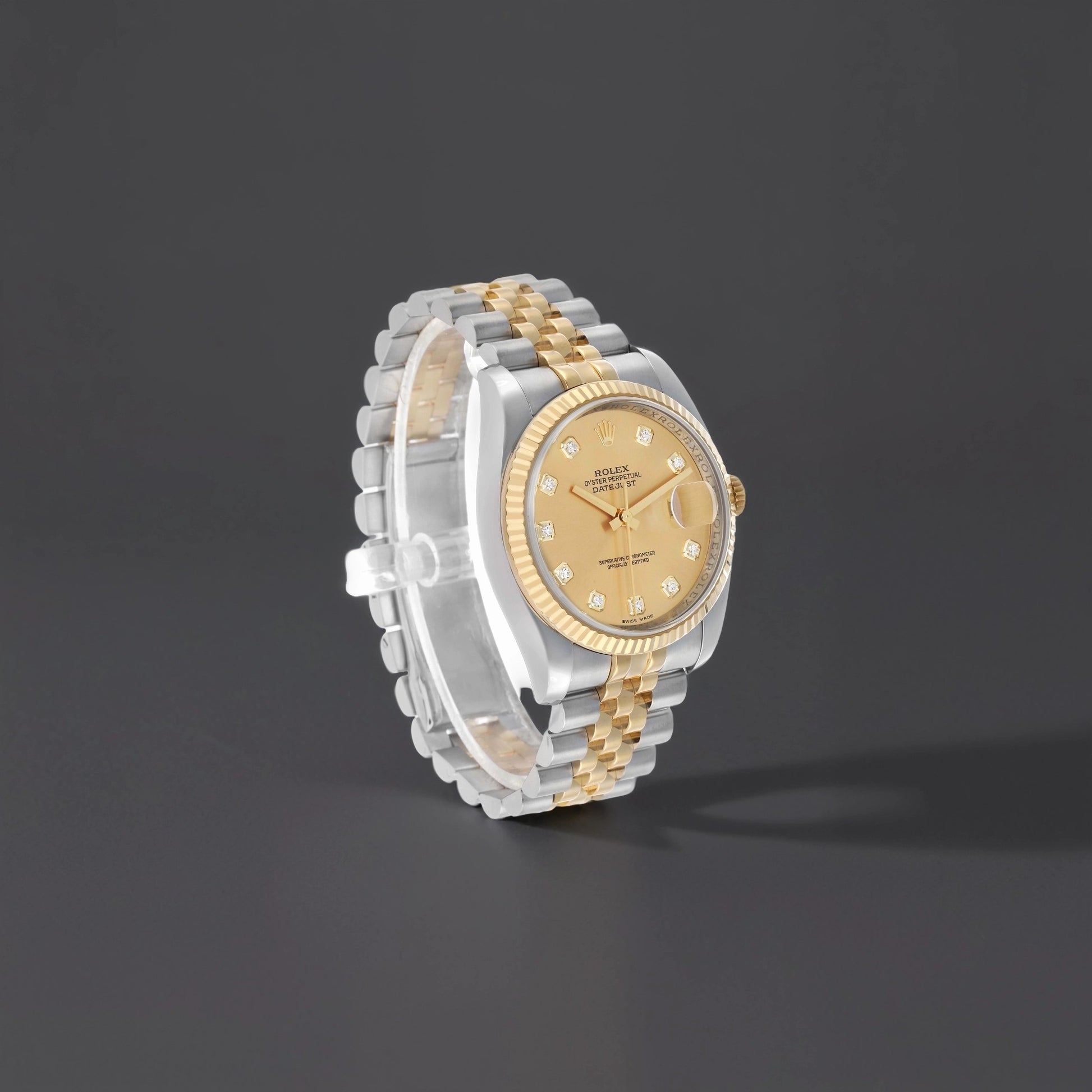Rolex Datejust Steel Yellow Gold Champagne Diamond Dial Mens Watch. Officially certified chronometer automatic self-winding movement. Stainless steel oyster case 36.0 mm in diameter. Rolex logo on the 18k yellow gold crown. 18k yellow gold fluted bezel. Scratch resistant sapphire crystal with a cyclops magnifier. Champagne dial with original Rolex factory diamond hour markers and yellow gold baton hands. Date calendar at the 3 o'clock aperture. Stainless steel and 18k yellow gold jubilee bracelet with a hidden clasp.
