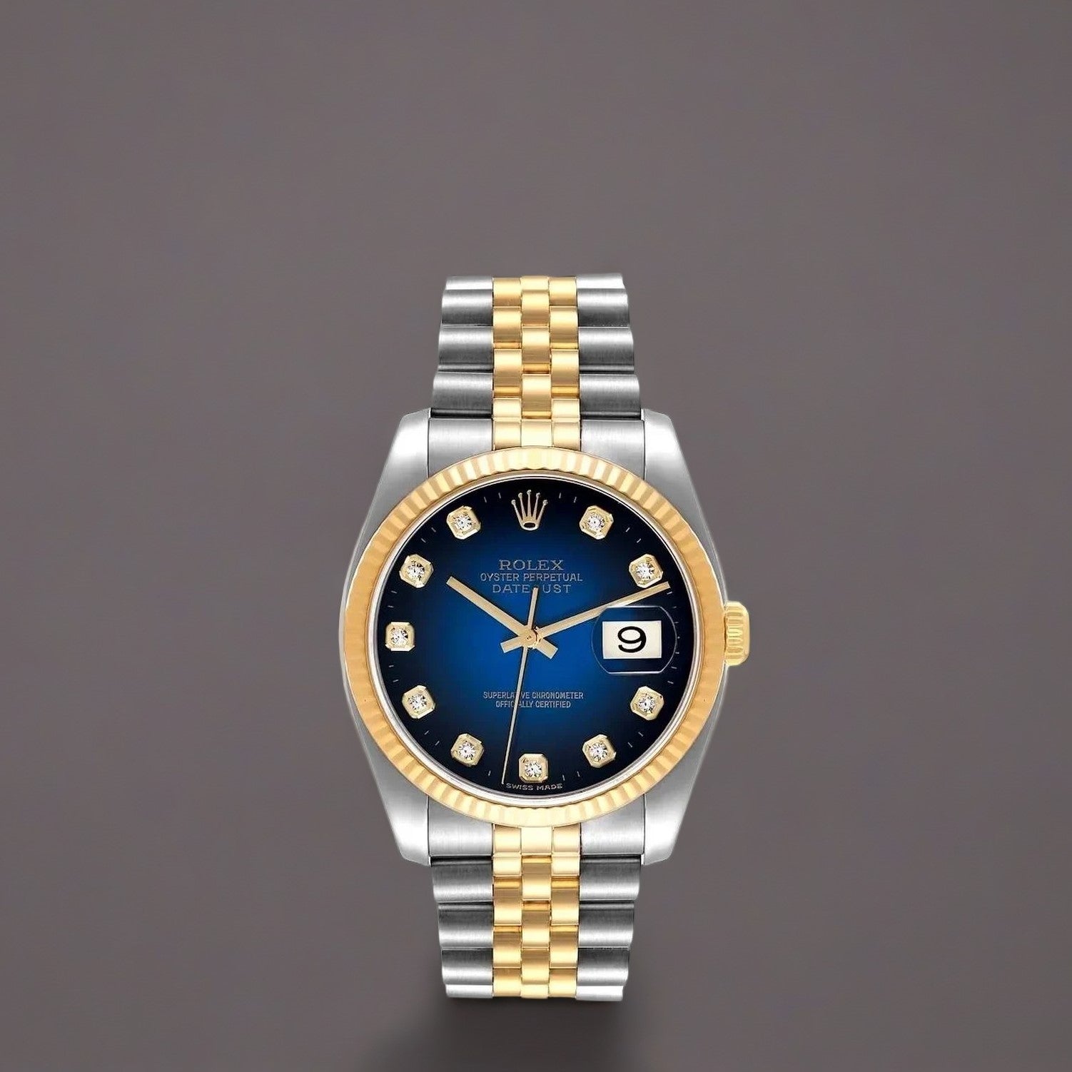Rolex Datejust Midsize Steel Yellow Gold Vignette Diamond Ladies Watch. Rolex logo on an 18K yellow gold crown. 18k yellow gold fluted bezel. Scratch resistant sapphire crystal with cyclops magnifier. Blue vignette dial with original Rolex factory diamond hour markers. Date calendar at 3 o'clock aperture. Stainless steel and 18k yellow gold jubilee bracelet with fold over clasp