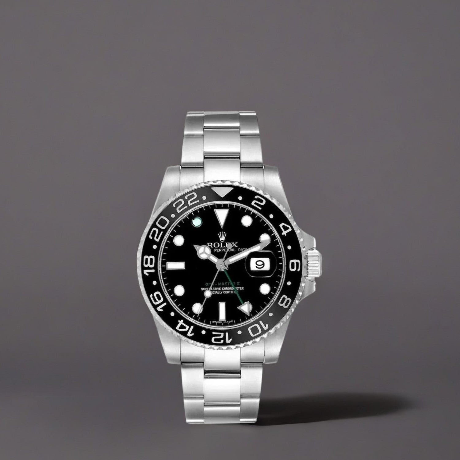 Rolex GMT Master II Black Dial Green Hand Steel Mens Watch. automatic self-winding movement. Stainless steel case 40.0 mm in diameter. Rolex logo on the crown. Stainless steel bidirectional rotating 24-hour bezel with black Cerachrom ceramic insert. Scratch resistant sapphire crystal with cyclops magnifier. Black dial with white luminescent hour markers and Mercedes hands. Green GMT hand. Date window at 3 o'clock aperture. Stainless steel oyster bracelet with flip lock clasp and easylink micro-adjustment.