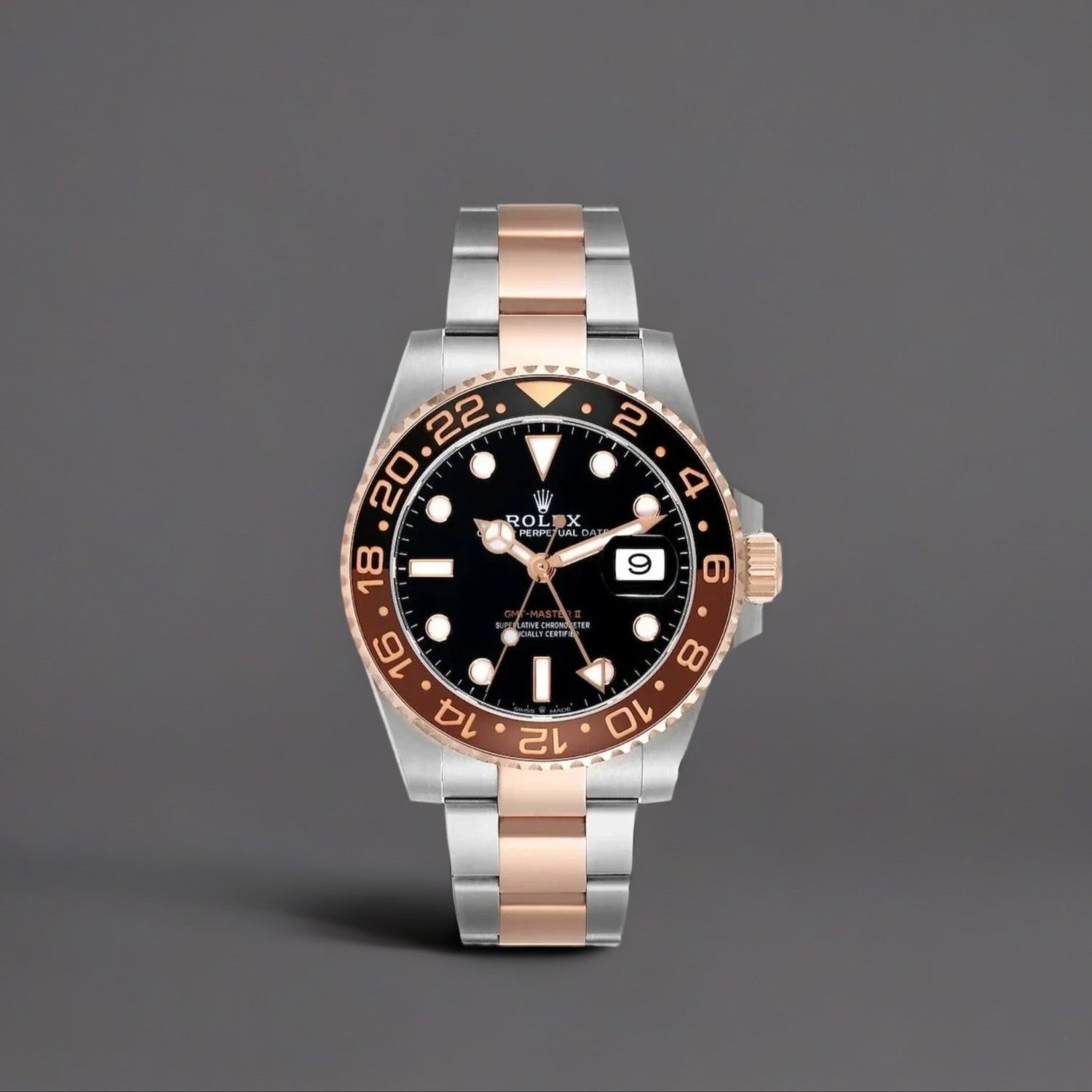 Rolex GMT Master II Root Beer Steel Rose Gold Mens Watch. automatic self-winding movement. Stainless steel and 18K Everose gold case 40.0 mm in diameter. Rolex logo on a crown. 18K Everose gold bidirectional rotating brown and black cerachrom bezel. Scratch resistant sapphire crystal. Black dial with rose gold outlined white luminescent hour markers and Mercedes hands. Date window at 3 o'clock aperture. Stainless steel and 18K rose gold oyster bracelet with flip-lock clasp.