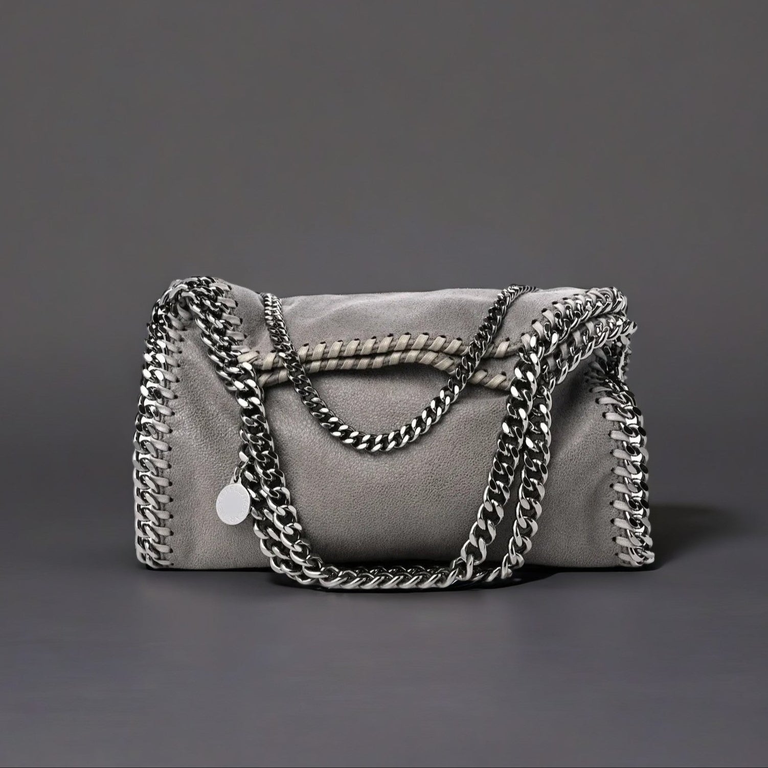 This is an authentic STELLA MCCARTNEY Shaggy Deer Mini Falabella Fold Over Tote in Light Grey. This chic fold-over tote is crafted of shimmery vegan faux leather in grey. The bag is bordered with silver chain links and continuous shoulder straps. The top opens with a magnet to a pink monogram jacquard fabric interior.
