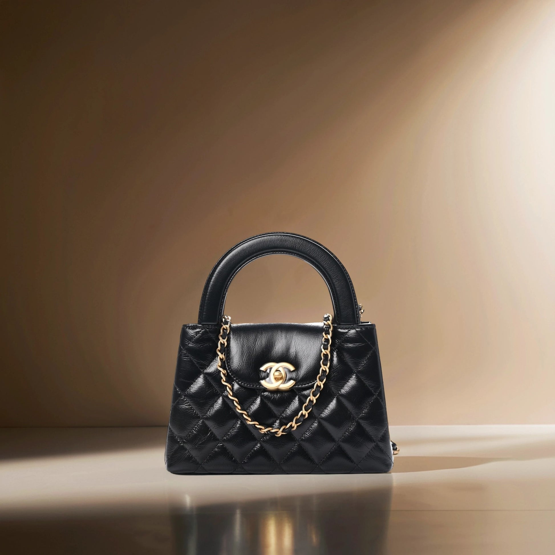This is an authentic CHANEL Shiny Aged Calfskin Quilted Nano Kelly Shopper in Black. This mini bag is a twist on an archival Chanel bag, featuring a long crossbody chain strap. This dual top handle bag is quilted in shiny aged calfskin leather in black, accented by aged gold hardware, including a Chanel CC turn-lock at the flap. This opens to a compact black leather interior with zipper and flat pockets.
