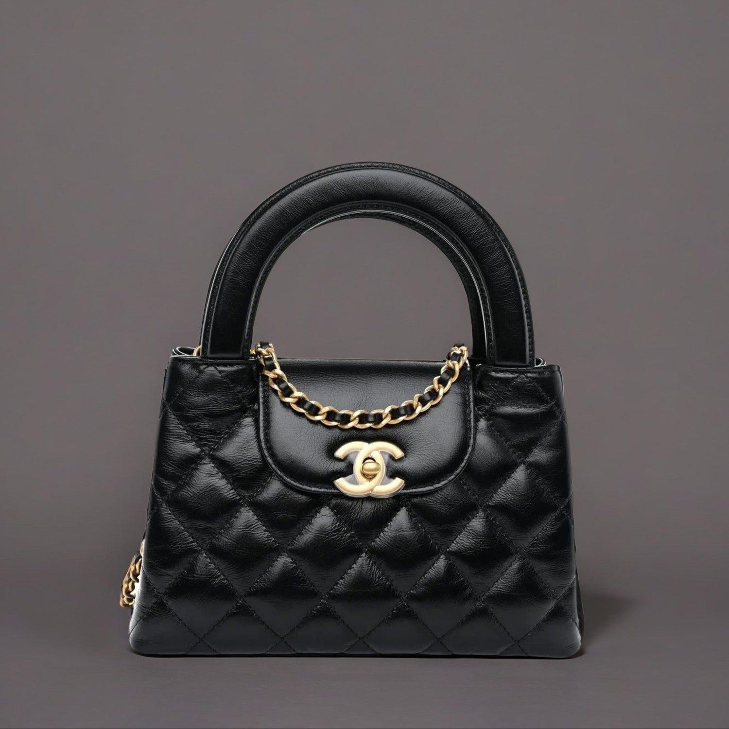 This is an authentic CHANEL Shiny Aged Calfskin Quilted Nano Kelly Shopper in Black. This mini bag is a twist on an archival Chanel bag, featuring a long crossbody chain strap. This dual top handle bag is quilted in shiny aged calfskin leather in black, accented by aged gold hardware, including a Chanel CC turn-lock at the flap. This opens to a compact black leather interior with zipper and flat pockets.