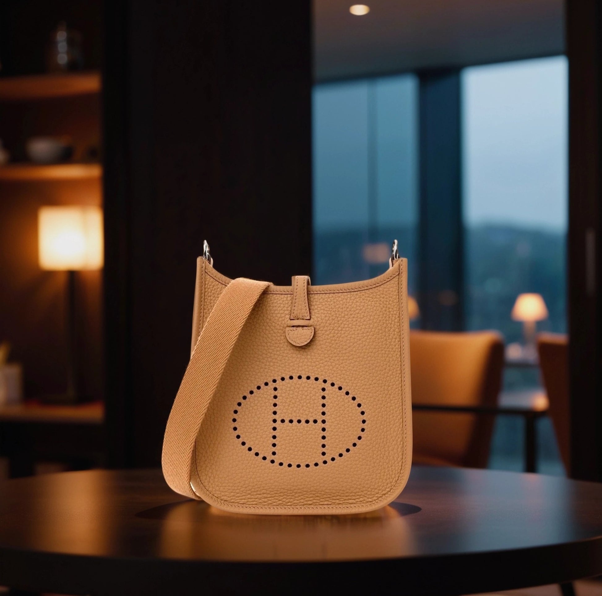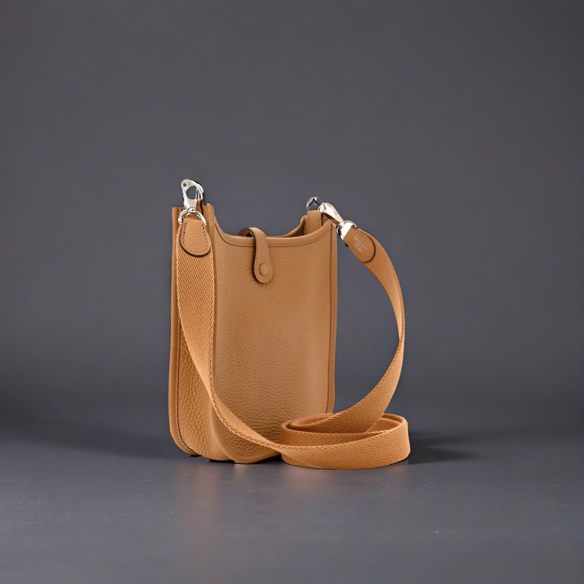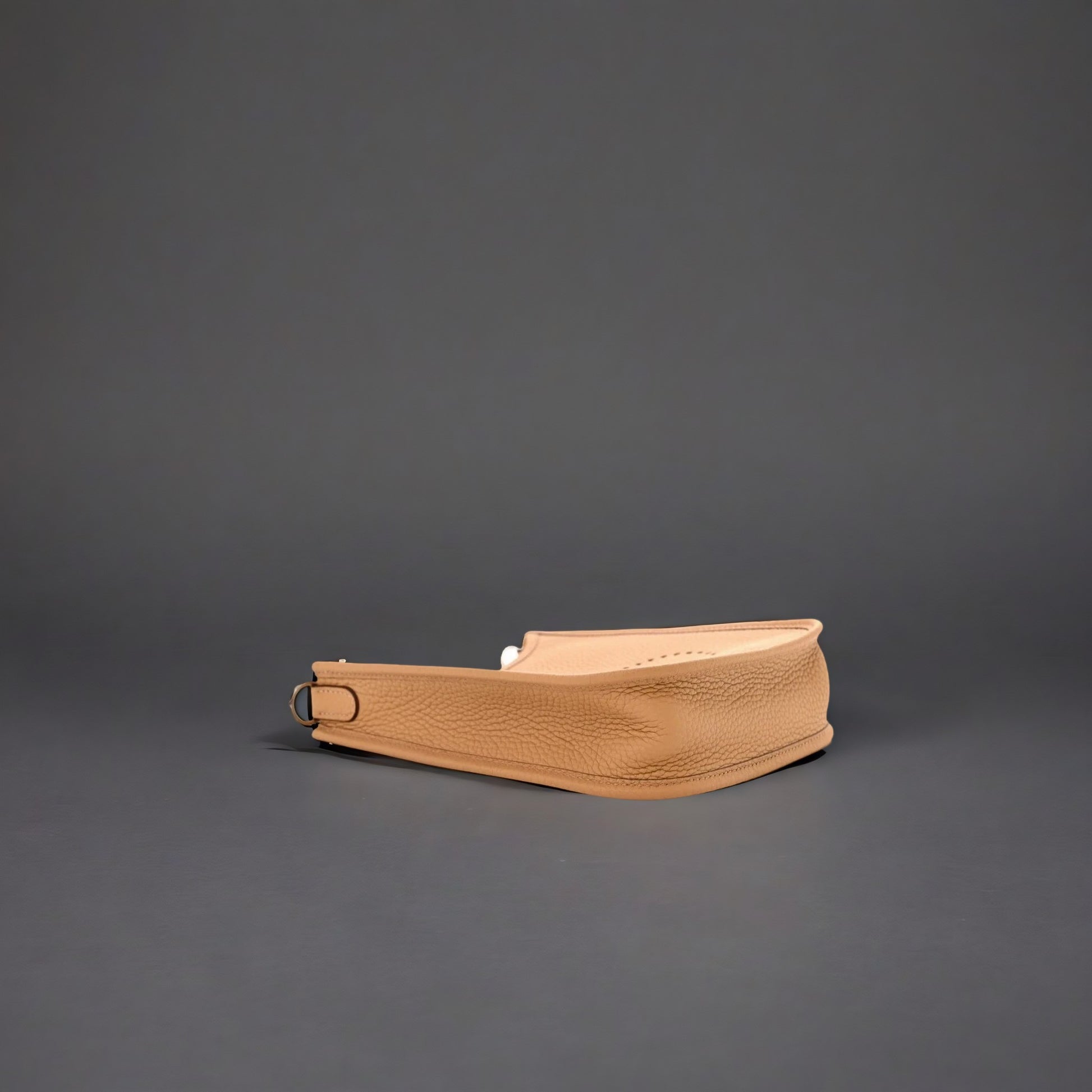 This is an authentic HERMES Taurillon Clemence Evelyne TPM in Biscuit. This petite messenger bag is crafted of rich taurillon clemence calfskin leather in light brown and features a perforated Hermes H oval logo on one side. The bag has a light brown canvas shoulder strap with polished palladium hardware. The top of the bag opens with a crossover strap to a brown suede interior.