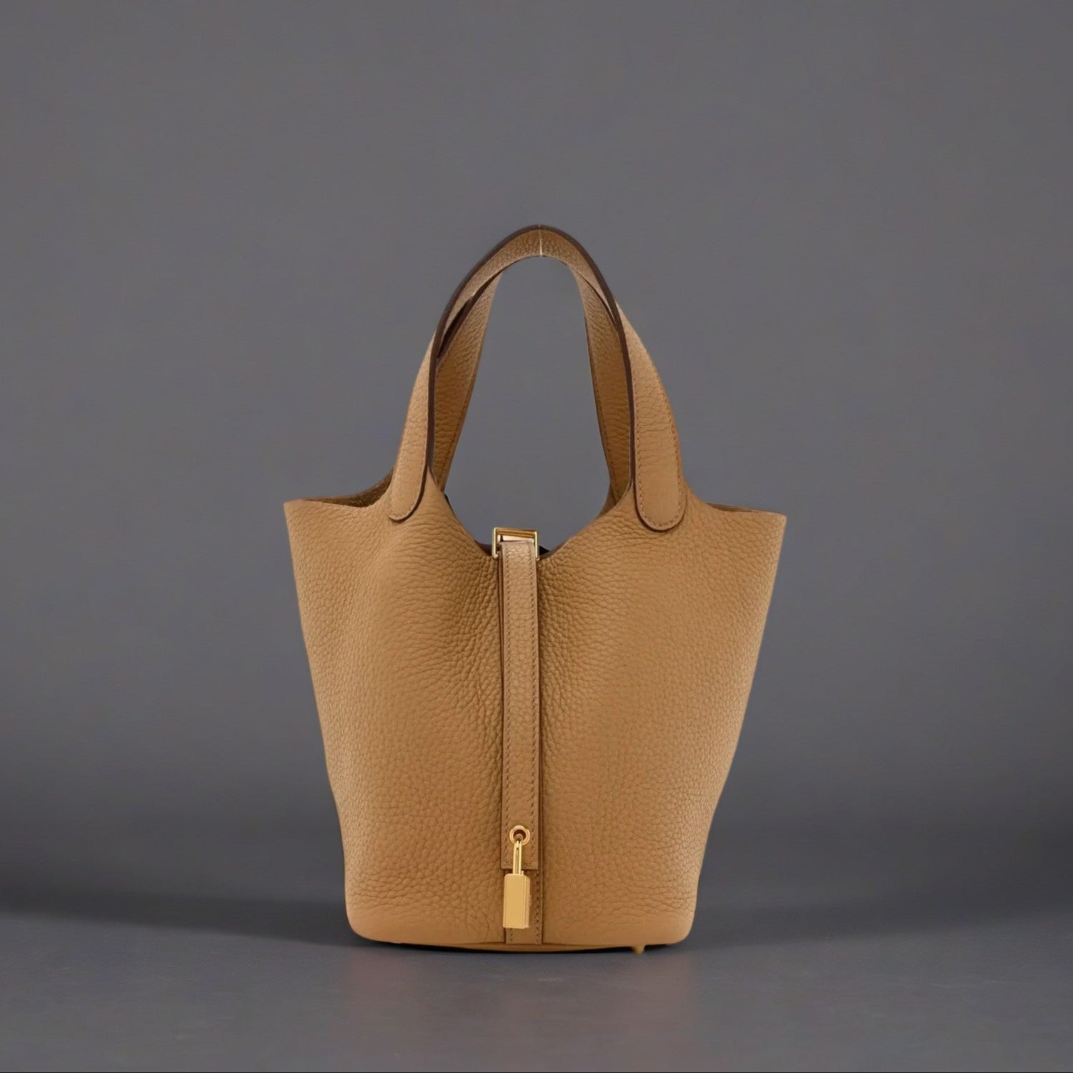 This is an authentic HERMES Taurillon Clemence Picotin Lock 18 PM in Biscuit. This tote is crafted of textured calfskin leather in light brown. This bucket-style bag features a unique one-piece reinforced design with leather top handles and a closure strap that is secured by a gold padlock. This opens to a spacious matching suede interior with a leather base.