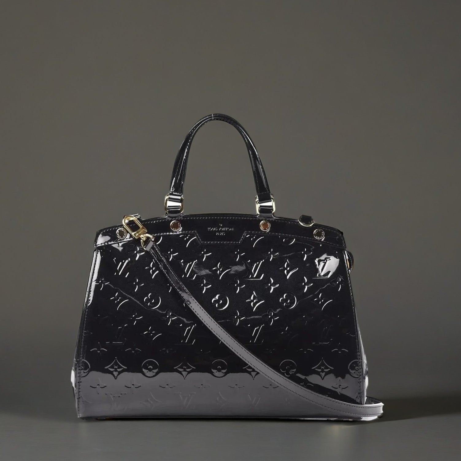 We guarantee this is an authentic LOUIS VUITTON Vernis Brea MM Black. This sophisticated tote is crafted of rich black Louis Vuitton shiny embossed vernis patent leather with smooth patent leather top handles, shoulder strap, trim, and base. The bag features brass hardware including strap links, feet for durability, and a double wrap around zipper. The top zips open to a black microfiber interior with zipper and patch pockets. This is a chic bag that will make an ideal bag for day or evening from Louis Vuitton.