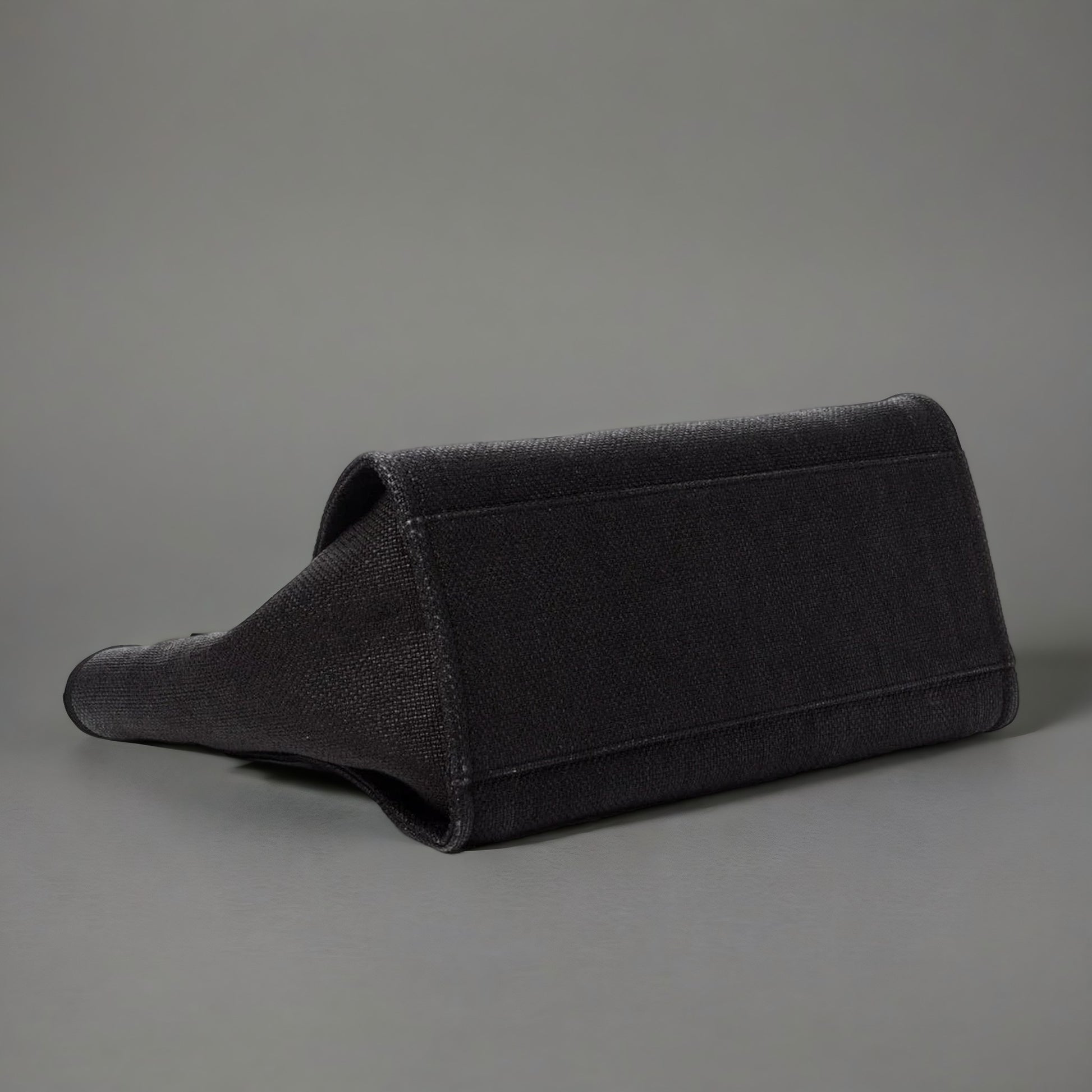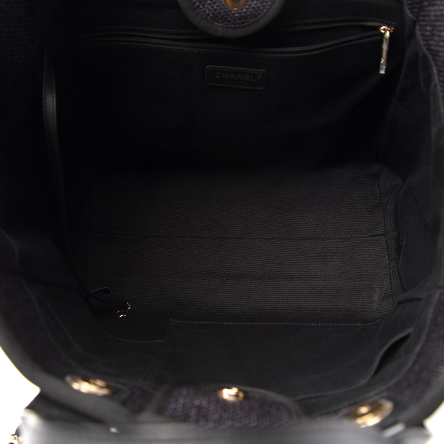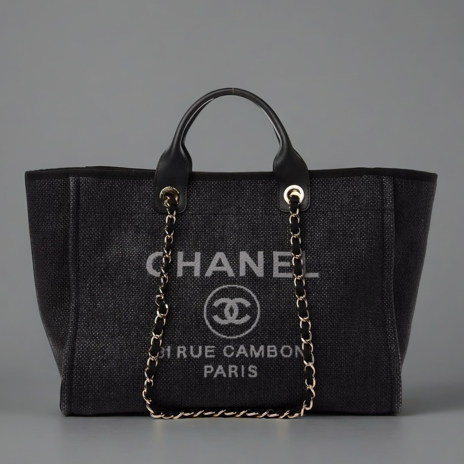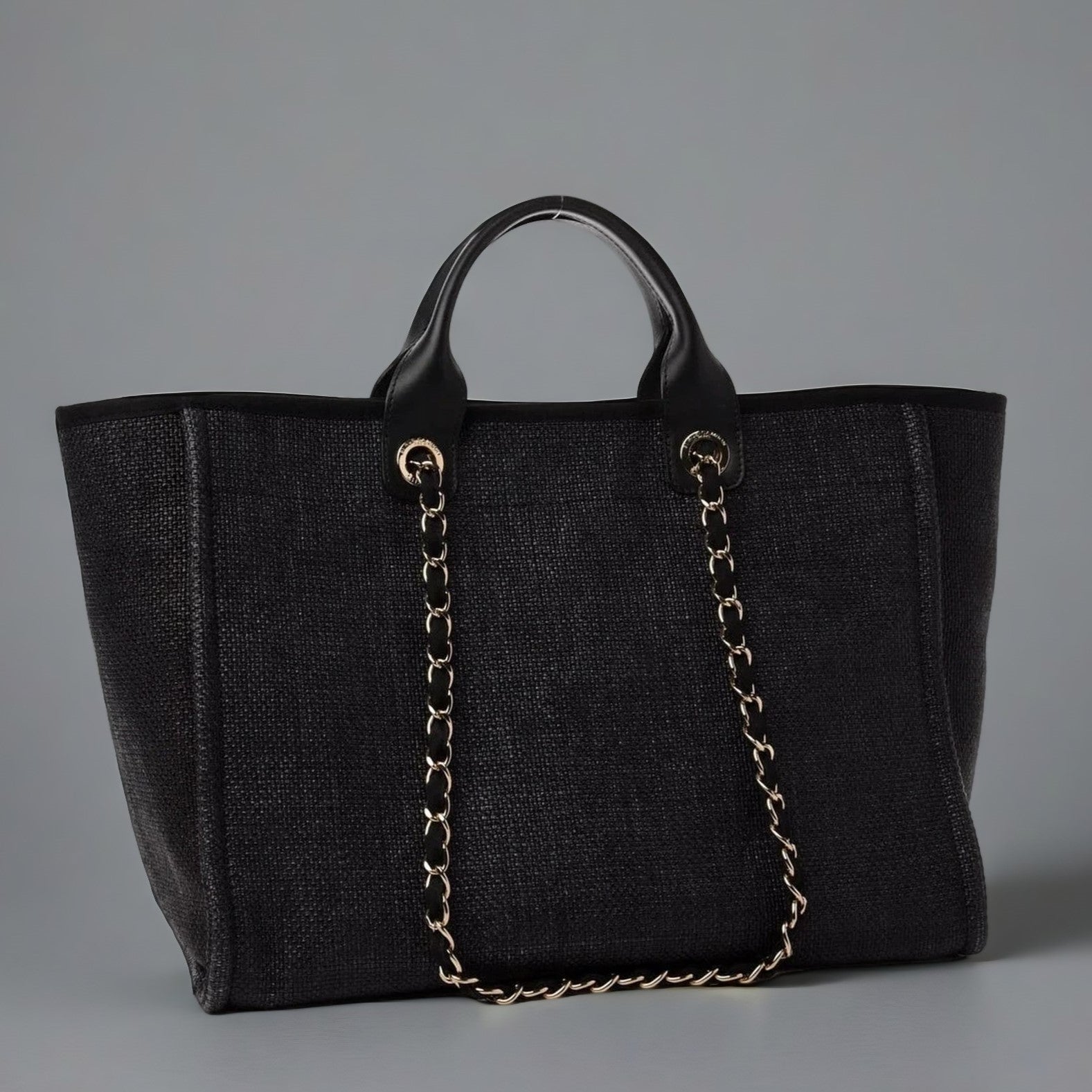 This is an authentic CHANEL Woven Straw Raffia Medium Deauville Tote in Black. This stylish hand bag is crafted of fine woven straw raffia in black with a grey embroidered Chanel Rue Cambon Paris logo. It features black rolled leather top handles, black fabric top trim and black fabric threaded gold chain shoulder straps. The top is open to a black fabric interior with zipper and patch pockets.